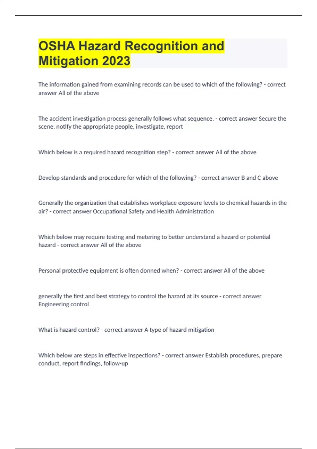 The information gained from examining records can be used to which of the following? All of the above The accident investigation process generally follows what sequence. Secure the scene, notify the appropriate people, investigate, report Which below is a required hazard recognition step? All of the above Develop standards and procedure for which of the following? B and C above Generally the organization that establishes workplace exposure levels to chemical hazards in the air? Occupational Safety and Health Administration Which below may require testing and metering to better understand a hazard or potential hazard All of the above Personal protective equipment is often donned when? All of the above generally the first and best strategy to control the hazard at its source Engineering control What is hazard control? A type of hazard mitigation Which below are steps in effective inspections? Establish procedures, prepare conduct, report findings, follow-up The point of preventive maintenance is to Get the work done before repairs or replacement is needed Effective communications includes which of the following? B and C above Test often conducted to initially identify and evaluate potential worker safety and health risks. Baseline survey