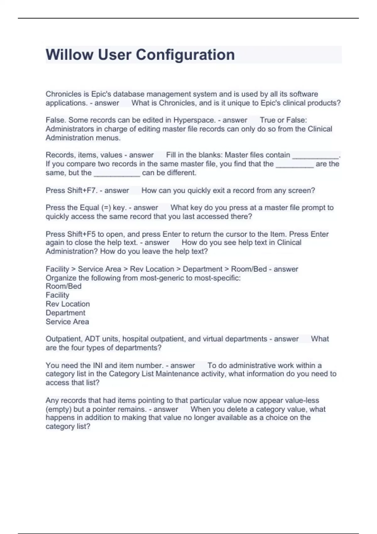 Willow User Configuration Questions with correct Answers