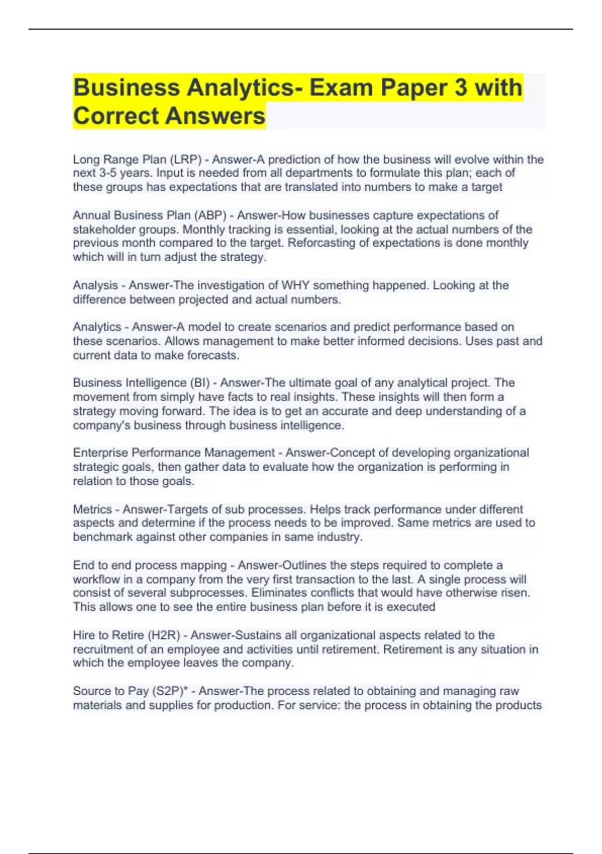 Long Range Plan (LRP) - Answer-A prediction of how the business will evolve within the next 3-5 years. Input is needed from all departments to formulate this plan; each of these groups has expectations that are translated into numbers to make a target Annual Business Plan (ABP) - Answer-How businesses capture expectations of stakeholder groups. Monthly tracking is essential, looking at the actual numbers of the previous month compared to the target. Reforcasting of expectations is done monthly which will in turn adjust the strategy. Analysis - Answer-The investigation of WHY something happened. Looking at the difference between projected and actual numbers. Analytics - Answer-A model to create scenarios and predict performance based on these scenarios. Allows management to make better informed decisions. Uses past and current data to make forecasts. Business Intelligence (BI) - Answer-The ultimate goal of any analytical project. The movement from simply have facts to real insights. These insights will then form a strategy moving forward. The idea is to get an accurate and deep understanding of a company's business through business intelligence. Enterprise Performance Management - Answer-Concept of developing organizational strategic goals, then gather data to evaluate how the organization is performing in relation to those goals. Metrics - Answer-Targets of sub processes. Helps track performance under different aspects and determine if the process needs to be improved. Same metrics are used to benchmark against other companies in same industry. End to end process mapping - Answer-Outlines the steps required to complete a workflow in a company from the very first transaction to the last. A single process will consist of several subprocesses. Eliminates conflicts that would have otherwise risen. This allows one to see the entire business plan before it is executed Hire to Retire (H2R) - Answer-Sustains all organizational aspects related to the recruitment of an employee and activities until retirement. Retirement is any situation in which the employee leaves the company. Source to Pay (S2P)* - Answer-The process related to obtaining and managing raw materials and supplies for production. For service: the process in obtaining the products
