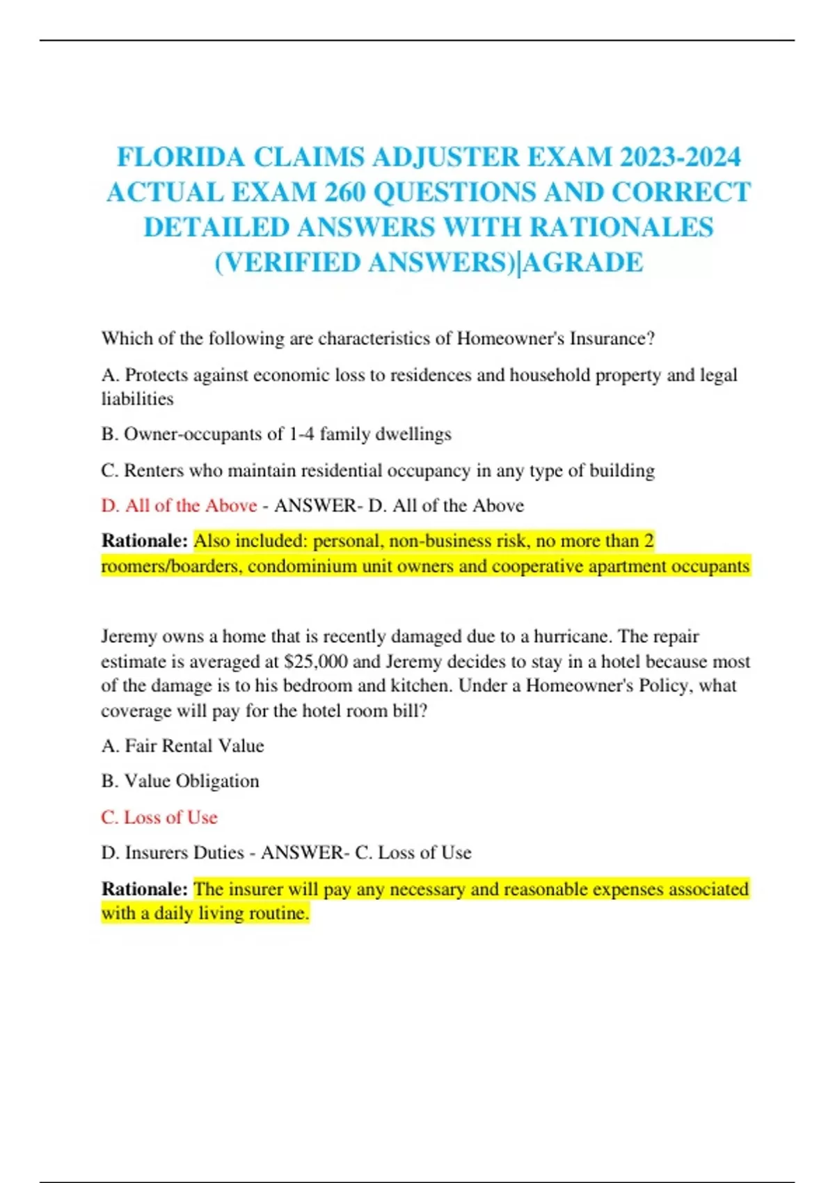 FLORIDA CLAIMS ADJUSTER EXAM ACTUAL EXAM 260 QUESTIONS AND CORRECT DETAILED ANSWERS WITH RATIONALES (VERIFIED ANSWERS)|AGRADE