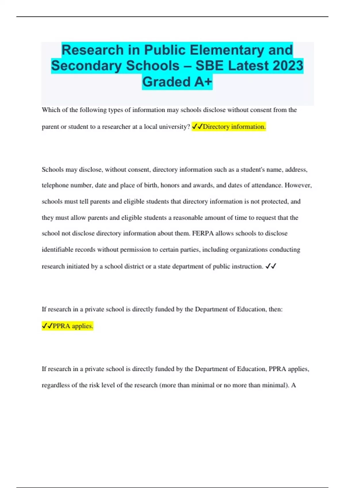 Research in Public Elementary and Secondary Schools – SBE Latest 2023 Graded A+ Which of the following types of information may schools disclose without consent from the parent or student to a researcher at a local university? Directory information. Schools may disclose, without consent, directory information such as a student's name, address, telephone number, date and place of birth, honors and awards, and dates of attendance. However, schools must tell parents and eligible students that directory information is not protected, and they must allow parents and eligible students a reasonable amount of time to request that the school not disclose directory information about them. FERPA allows schools to disclose identifiable records without permission to certain parties, including organizations conducting research initiated by a school district or a state department of public instruction. If research in a private school is directly funded by the Department of Education, then: PPRA applies. If research in a private school is directly funded by the Department of Education, PPRA applies, regardless of the risk level of the research (more than minimal or no more than minimal). A private school that does not receive any federal funding is not subject to the provisions of FERPA or PPRA. The purpose of the Family Educational Rights and Privacy Act (FERPA) is to: Provide parents certain rights over their children's educational records. The purpose of FERPA is to give parents certain rights with regard to the release of their children's educational records. School personnel such as teachers, counselors, and principals may access student records for legitimate school functions. Generally, schools must have written permission from a parent before releasing any identifiable information from a student's record. In addition to the general provisions of the Common Rule (the federal regulations for protecting research subjects), the following regulations also govern research in the public schools: FERPA, PPRA, and Subpart D of the federal regulations FERPA, PPRA, and Subpart D of the federal regulations also govern research in the public schools. Which federal regulation or law governs how researchers can obtain data about subjects' disciplinary status in school from academic records? The Family Educational Rights and Privacy Act. A student's disciplinary status is part of his or her school record. In accordance with FERPA, schools must usually have written parental permission before they can release data from school records to researchers. The Protection of Pupil Rights amendment is concerned with the kinds of questions that may be included in surveys and interviews with minor school children. The No Child Left Behind Act is a specific amendment to PPRA that gives parents additional rights over the content of research materials. Subpart D of 45 CFR 46 is concerned with the rights of children as research subjects and does not regulate school systems. If the research is subject to Subpart D, which of the following research activities with children would qualify for an exemption under Category 2 (research that includes educational tests, surveys, interviews, observation)? Research about aptitude testing Subpart D, Additional HHS Protections for Children, specifically prohibits the use of exemption for research involving survey procedures, interview procedures, or participant observation when the researcher participates in the activities being observed. PPRA gives parents some level of control over their child's: Participation in third-party survey research or exposure to instructional materials developed by researchers Parental notification, in lieu of active parental permission, is allowed when: An IRB has approved a waiver of the requirement for parental permission. PPRA gives parents some level of control over their child's participation in third-party survey research or exposure to instructional materials developed by researchers. FERPA gives parents certain rights with respect to their children's educational records. The ability to opt out of health education would be an institutional, local or state law, and is not covered in this module about research. The access to medical records would be covered under Health Insurance Portability and Accountability Act (HIPAA) and is not covered in this module as it does not relate to research in public schools. Parental permission must be secured or waived in accordance with criteria established by federal regulation. When a waiver has been approved, investigators may wish to, and IRBs may require, that parents be notified that the study will take place, giving them the opportunity to withdraw their children from the study. Parental notification can never be substituted for active parental permission if the criteria for a waiver have not been met.