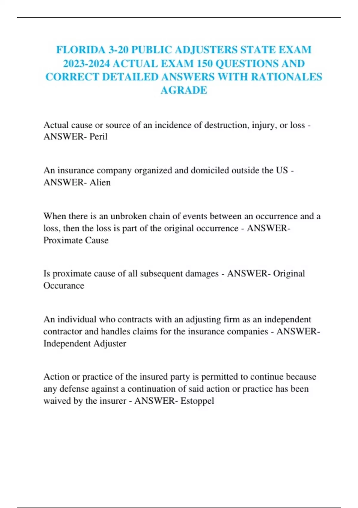 FLORIDA 3-20 PUBLIC ADJUSTERS STATE EXAM ACTUAL EXAM 150 QUESTIONS AND CORRECT DETAILED ANSWERS WITH RATIONALES AGRADE