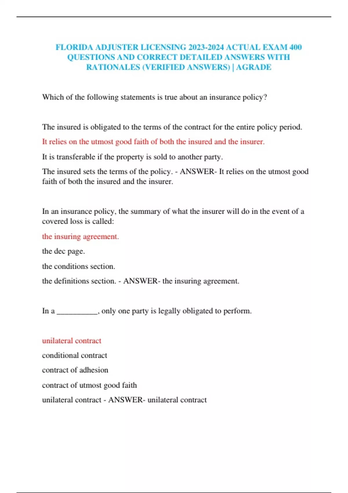 FLORIDA ADJUSTER LICENSING ACTUAL EXAM 400 QUESTIONS AND CORRECT DETAILED ANSWERS WITH RATIONALES (VERIFIED ANSWERS) | AGRADE