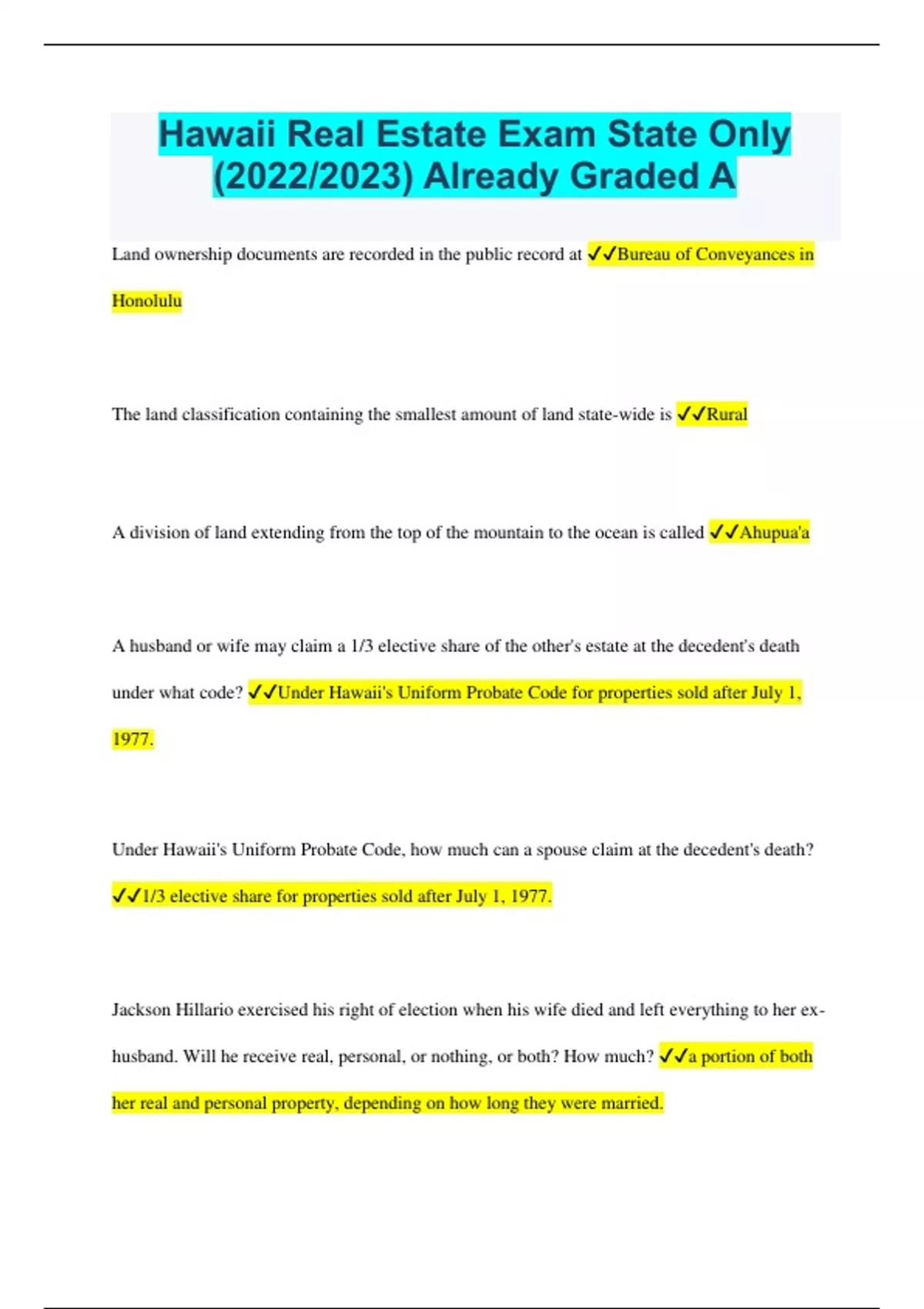 Land ownership documents are recorded in the public record at Bureau of Conveyances in Honolulu The land classification containing the smallest amount of land state-wide is Rural A division of land extending from the top of the mountain to the ocean is called Ahupua'a A husband or wife may claim a 1/3 elective share of the other's estate at the decedent's death under what code? Under Hawaii's Uniform Probate Code for properties sold after July 1, 1977. Under Hawaii's Uniform Probate Code, how much can a spouse claim at the decedent's death? 1/3 elective share for properties sold after July 1, 1977. Jackson Hillario exercised his right of election when his wife died and left everything to her exhusband. Will he receive real, personal, or nothing, or both? How much? a portion of both her real and personal property, depending on how long they were married