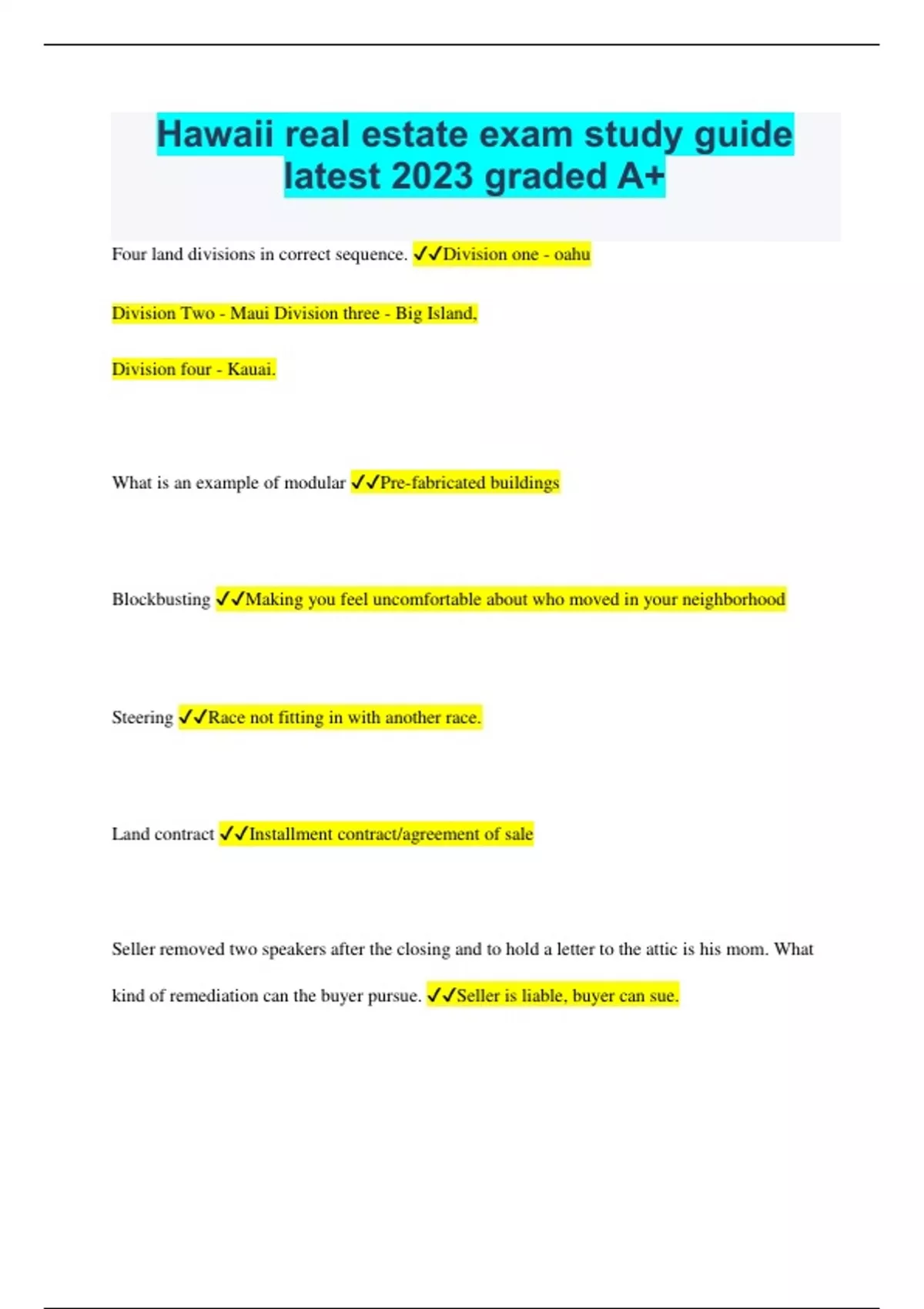 Hawaii real estate exam study guide latest 2023 graded A+