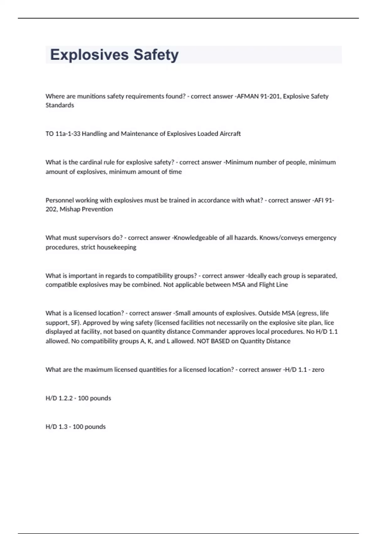 Where are munitions safety requirements found? - correct answer -AFMAN 91-201, Explosive Safety Standards TO 11a-1-33 Handling and Maintenance of Explosives Loaded Aircraft What is the cardinal rule for explosive safety? - correct answer -Minimum number of people, minimum amount of explosives, minimum amount of time Personnel working with explosives must be trained in accordance with what? - correct answer -AFI 91-202, Mishap Prevention What must supervisors do? - correct answer -Knowledgeable of all hazards. Knows/conveys emergency procedures, strict housekeeping What is important in regards to compatibility groups? - correct answer -Ideally each group is separated, compatible explosives may be combined. Not applicable between MSA and Flight Line What is a licensed location? - correct answer -Small amounts of explosives. Outside MSA (egress, life support, SF). Approved by wing safety (licensed facilities not necessarily on the explosive site plan, lice displayed at facility, not based on quantity distance Commander approves local procedures. No H/D 1.1 allowed. No compatibility groups A, K, and L allowed. NOT BASED on Quantity Distance What are the maximum licensed quantities for a licensed location? - correct answer -H/D 1.1 - zero H/D 1.2.2 - 100 pounds H/D 1.3 - 100 pounds