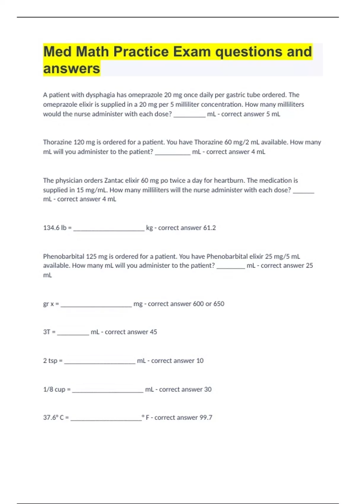 A patient with dysphagia has omeprazole 20 mg once daily per gastric tube ordered. The omeprazole elixir is supplied in a 20 mg per 5 milliliter concentration. How many milliliters would the nurse administer with each dose? _________ mL 5 mL Thorazine 120 mg is ordered for a patient. You have Thorazine 60 mg/2 mL available. How many mL will you administer to the patient? __________ mL 4 mL The physician orders Zantac elixir 60 mg po twice a day for heartburn. The medication is supplied in 15 mg/mL. How many milliliters will the nurse administer with each dose? ______ mL 4 mL 134.6 lb = ____________________ kg 61.2 Phenobarbital 125 mg is ordered for a patient. You have Phenobarbital elixir 25 mg/5 mL available. How many mL will you administer to the patient? ________ mL 25 mL gr x = ____________________ mg 600 or 650 3T = _________ mL 45 2 tsp = ____________________ mL 10 1/8 cup = ____________________ mL 30 37.6° C = ____________________° F 99.7 The physician orders Zestril 12.5 mg po daily for hypertension. The medication is supplied in 5-mg tablets. How many tablets will the nurse administer? _________ tab 2.5 tab The physician orders Lanoxin elixir 180 mcg po daily for congestive heart failure. The medication is dispensed with a concentration of 0.05 mg/mL. How many milliliters will the nurse administer? _________ mL 3.6 mL The physician orders acetaminophen 325 mg po q4 h for temperature higher than 101° F. The medication is supplied in gr v tablets. The patient's temperature is 36.8° C. How many tablets will the nurse administer at this time? _______ tab 0 tab 168,659 mcg = ____________________ g 0.17 g The physician orders Methergine 0.4 mg po twice a day for postpartum bleeding. The medication is supplied in 0.2 mg tablets. How many tablets will the nurse administer with each dose? ________ tab 2 tab The physician orders Prozac liquid 48 mg po daily for depression. The medication label indicates that the medication is dispensed with 4 mg/mL. How many milliliters will the nurse administer with each dose? _______ mL 12 mL The physician orders lorazepam 75 mcg oral every 4 to 6 hours for a patient with anxiety. The medication is supplied as lorazepam 0.025 mg per tablet. How many tablets of lorazepam would the patient receive with each dose? _________ tab 3 tab The physician orders Synthroid 150 mcg po daily for hypothyroidism. The medication is supplied in 0.075 mg tablets. How many tablets will the nurse administer with each dose? 2 tab KCl 30 mEq is ordered for a patient. You have KCl 40 mEq/30 mL How many mL will you administer to the patient? _________ mL 22.5 mL