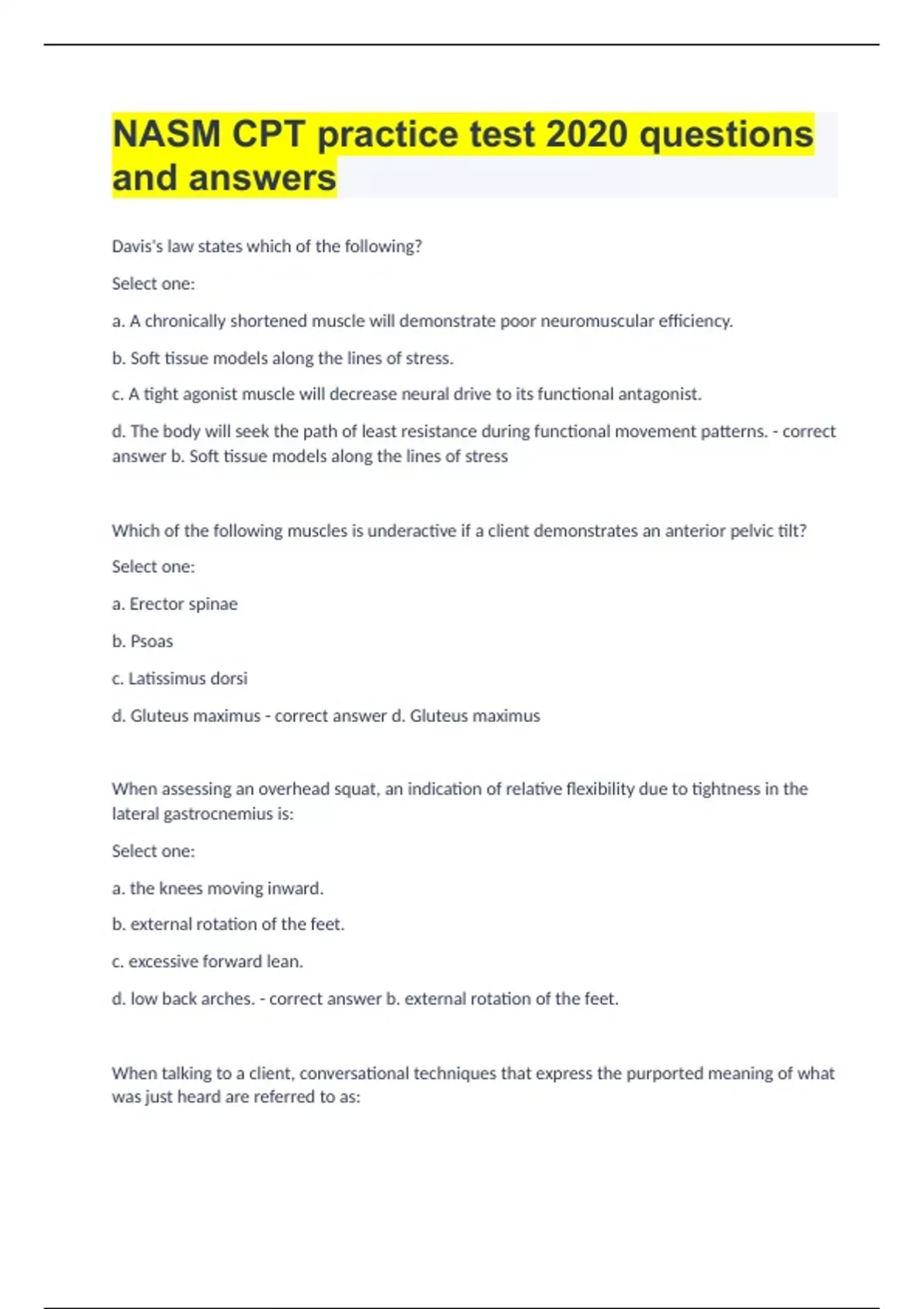 nasm cpt practice test 2020 questions and answers