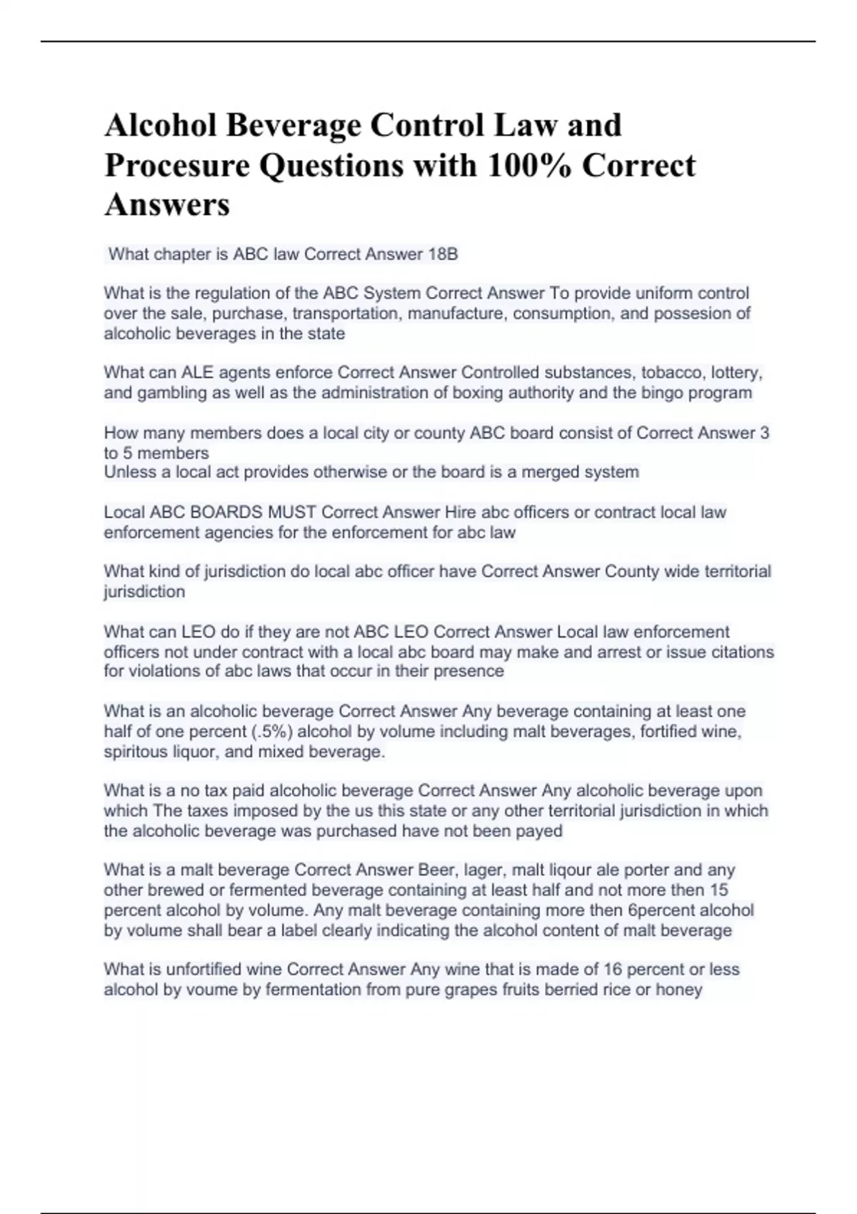 Alcohol Beverage Control Law and Procesure Questions with 100% Correct Answers