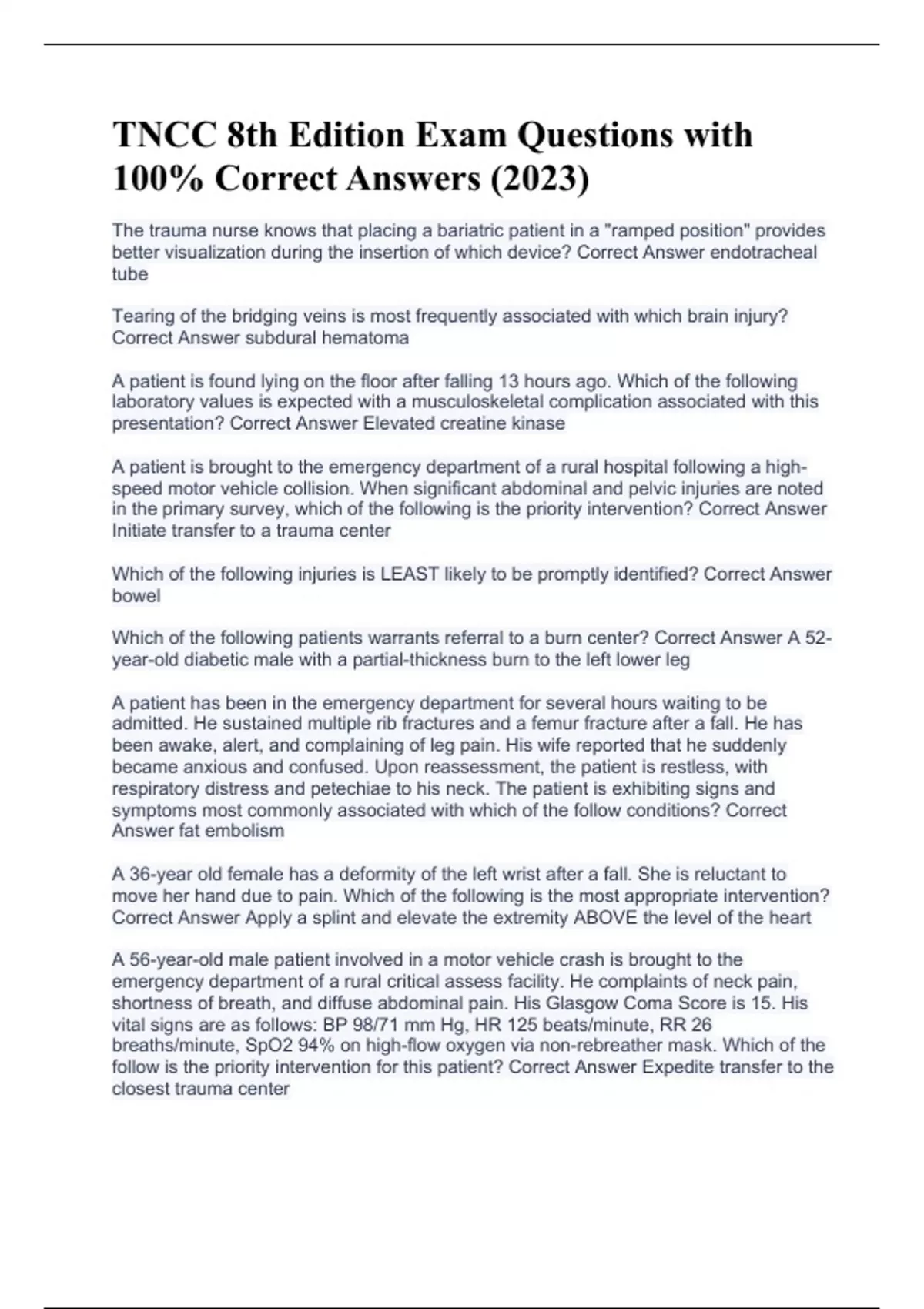 TNCC 8th Edition Exam Questions with 100% Correct Answers (2023)