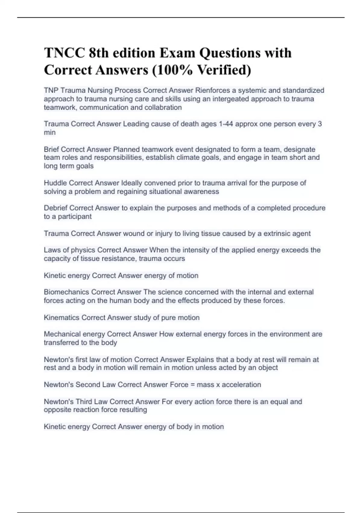 TNP Trauma Nursing Process Correct Answer Rienforces a systemic and standardized approach to trauma nursing care and skills using an intergeated approach to trauma teamwork, communication and collabration Trauma Correct Answer Leading cause of death ages 1-44 approx one person every 3 min Brief Correct Answer Planned teamwork event designated to form a team, designate team roles and responsibilities, establish climate goals, and engage in team short and long term goals Huddle Correct Answer Ideally convened prior to trauma arrival for the purpose of solving a problem and regaining situational awareness Debrief Correct Answer to explain the purposes and methods of a completed procedure to a participant Trauma Correct Answer wound or injury to living tissue caused by a extrinsic agent Laws of physics Correct Answer When the intensity of the applied energy exceeds the capacity of tissue resistance, trauma occurs Kinetic energy Correct Answer energy of motion Biomechanics Correct Answer The science concerned with the internal and external forces acting on the human body and the effects produced by these forces. Kinematics Correct Answer study of pure motion Mechanical energy Correct Answer How external energy forces in the environment are transferred to the body Newton's first law of motion Correct Answer Explains that a body at rest will remain at rest and a body in motion will remain in motion unless acted by an object