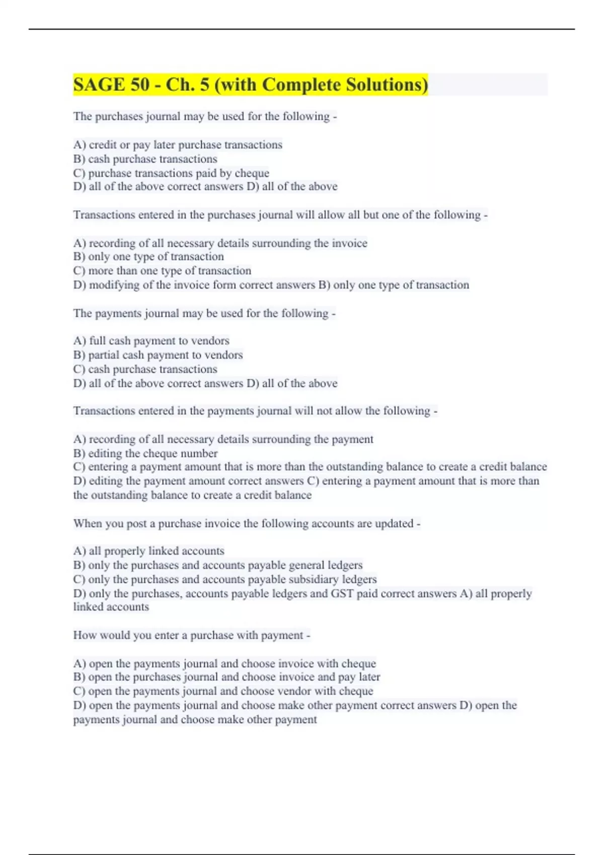 The purchases journal may be used for the following - A) credit or pay later purchase transactions B) cash purchase transactions C) purchase transactions paid by cheque D) all of the above correct answers D) all of the above Transactions entered in the purchases journal will allow all but one of the following - A) recording of all necessary details surrounding the invoice B) only one type of transaction C) more than one type of transaction D) modifying of the invoice form correct answers B) only one type of transaction The payments journal may be used for the following - A) full cash payment to vendors B) partial cash payment to vendors C) cash purchase transactions D) all of the above correct answers D) all of the above Transactions entered in the payments journal will not allow the following - A) recording of all necessary details surrounding the payment B) editing the cheque number C) entering a payment amount that is more than the outstanding balance to create a credit balance D) editing the payment amount correct answers C) entering a payment amount that is more than the outstanding balance to create a credit balance When you post a purchase invoice the following accounts are updated - A) all properly linked accounts B) only the purchases and accounts payable general ledgers C) only the purchases and accounts payable subsidiary ledgers D) only the purchases, accounts payable ledgers and GST paid correct answers A) all properly linked accounts How would you enter a purchase with payment - A) open the payments journal and choose invoice with cheque B) open the purchases journal and choose invoice and pay later C) open the payments journal and choose vendor with cheque D) open the payments journal and choose make other payment correct answers D) open the payments journal and choose make other payment