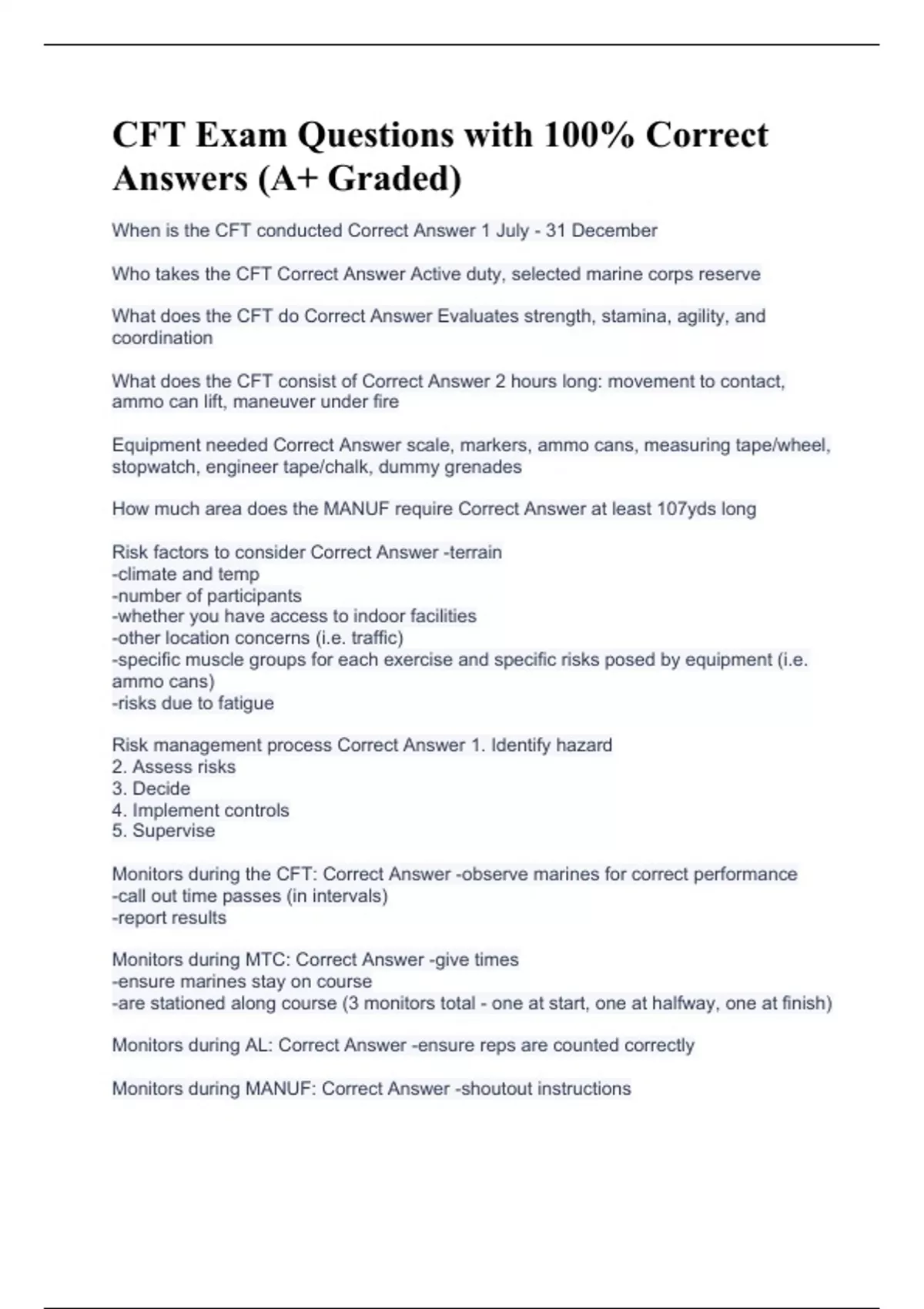 When is the CFT conducted Correct Answer 1 July - 31 December Who takes the CFT Correct Answer Active duty, selected marine corps reserve What does the CFT do Correct Answer Evaluates strength, stamina, agility, and coordination What does the CFT consist of Correct Answer 2 hours long: movement to contact, ammo can lift, maneuver under fire Equipment needed Correct Answer scale, markers, ammo cans, measuring tape/wheel, stopwatch, engineer tape/chalk, dummy grenades How much area does the MANUF require Correct Answer at least 107yds long Risk factors to consider Correct Answer -terrain -climate and temp -number of participants -whether you have access to indoor facilities -other location concerns (i.e. traffic) -specific muscle groups for each exercise and specific risks posed by equipment (i.e. ammo cans) -risks due to fatigue Risk management process Correct Answer 1. Identify hazard 2. Assess risks 3. Decide 4. Implement controls 5. Supervise Monitors during the CFT: Correct Answer -observe marines for correct performance -call out time passes (in intervals) -report results Monitors during MTC: Correct Answer -give times -ensure marines stay on course -are stationed along course (3 monitors total - one at start, one at halfway, one at finish) Monitors during AL: Correct Answer -ensure reps are counted correctly Monitors during MANUF: Correct Answer -shoutout instructions