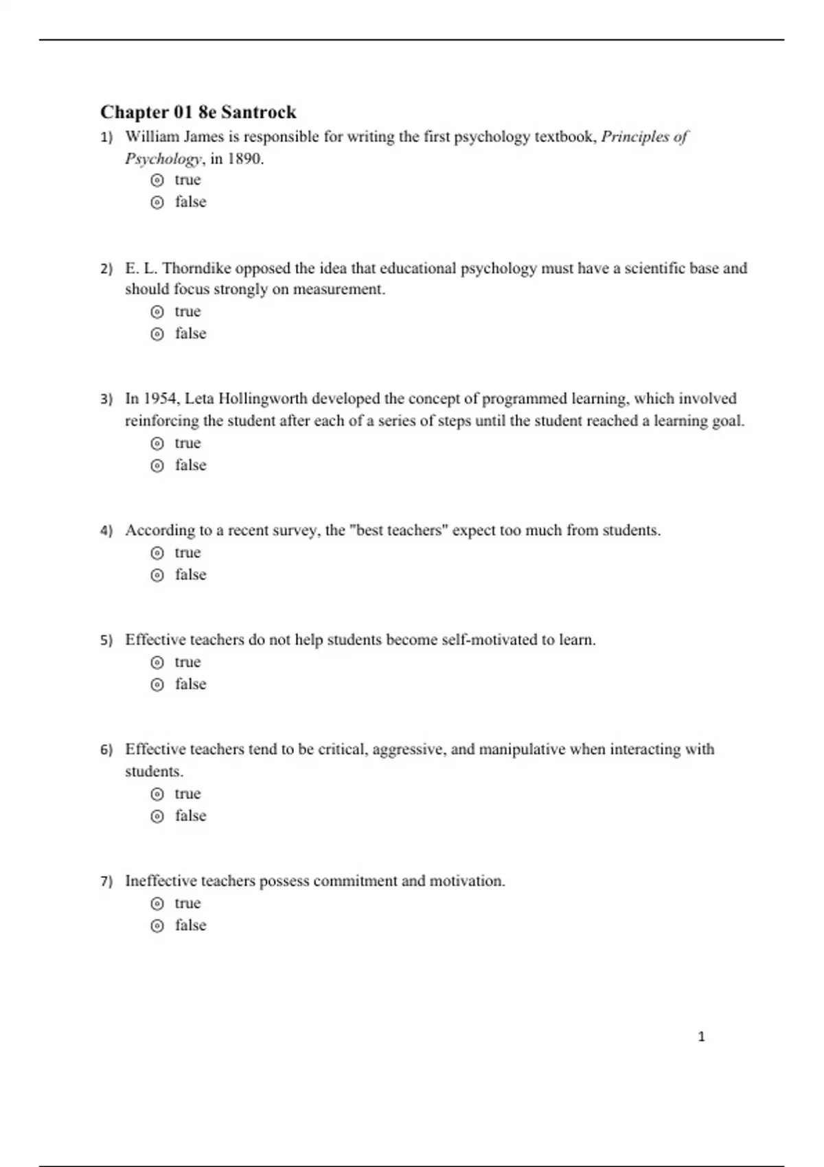 Test Bank for Educational Psychology 8e 8th Edition by John Santrock. Full Chapters test bank are included - Chapter 1 to 16 CHAPTER 1 Educational Psychology: A Tool for Effective Teaching CHAPTER 2 Cognitive and Language Development CHAPTER 3 Social Contexts and Socioemotional Development CHAPTER 4 Individual Variations CHAPTER 5 Sociocultural Diversity CHAPTER 6 Learners Who Are Exceptional CHAPTER 7 Behavioral and Social Cognitive Approaches CHAPTER 8 The Information-Processing Approach CHAPTER 9 Complex Cognitive Processes CHAPTER 10 Social Constructivist Approaches CHAPTER 11 Learning and Cognition in the Content Areas CHAPTER 12 Planning, Instruction, and Technology CHAPTER 13 Motivation, Teaching, and Learning CHAPTER 14 Managing the Classroom CHAPTER 15 Standardized Tests and Teaching CHAPTER 16 Classroom Assessment and Grading