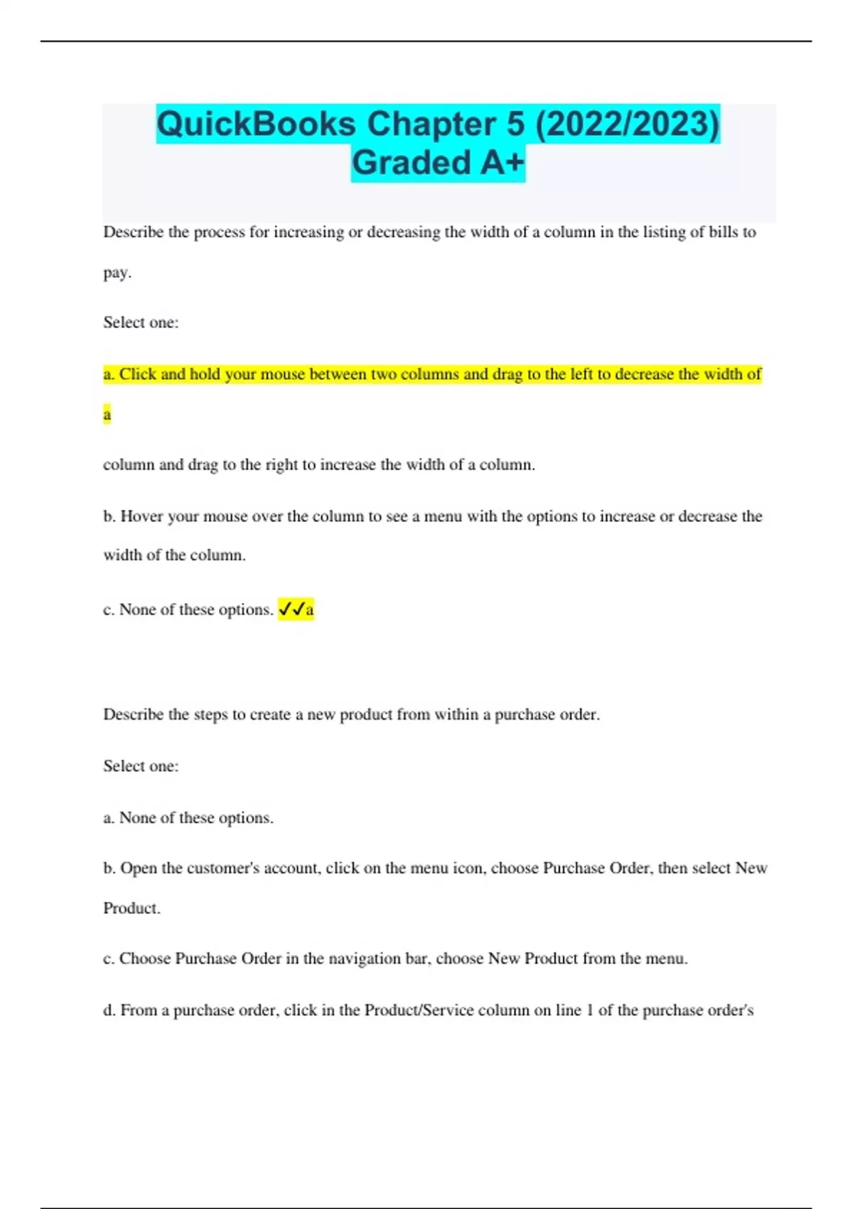 Describe the process for increasing or decreasing the width of a column in the listing of bills to pay. Select one: a. Click and hold your mouse between two columns and drag to the left to decrease the width of a column and drag to the right to increase the width of a column. b. Hover your mouse over the column to see a menu with the options to increase or decrease the width of the column. c. None of these options. a Describe the steps to create a new product from within a purchase order. Select one: a. None of these options. b. Open the customer's account, click on the menu icon, choose Purchase Order, then select New Product. c. Choose Purchase Order in the navigation bar, choose New Product from the menu. d. From a purchase order, click in the Product/Service column on line 1 of the purchase order's