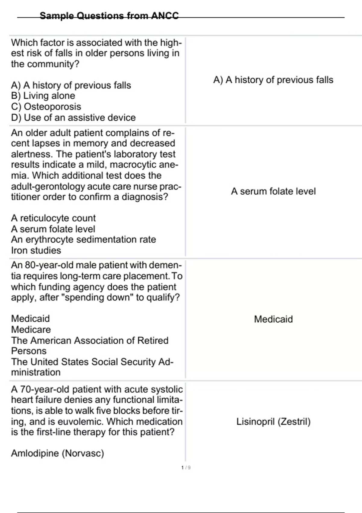 Which factor is associated with the high- est risk of falls in older persons living in the community? A) A history of previous falls B) Living alone C) Osteoporosis D) Use of an assistive device An older adult patient complains of re- cent lapses in memory and decreased alertness. The patient's laboratory test results indicate a mild, macrocytic ane- mia. Which additional test does the adult-gerontology acute care nurse practitioner order to confirm a diagnosis? A reticulocyte count A serum folate level An erythrocyte sedimentation rate Iron studies An 80-year-old male patient with dementia requires long-term care placement.To which funding agency does the patient apply, after "spending down" to qualify? Medicaid Medicare The American Association of Retired Persons The United States Social Security Ad- ministration A 70-year-old patient with acute systolic heart failure denies any functional limitations, is able to walk five blocks before tiring, and is euvolemic. Which medication is the first-line therapy for this patient? Amlodipine (Norvasc) A) A history of previous falls A serum folate level Medicaid Lisinopril (Zestril) Sample Questions from ANCC 2 / 9 Digoxin (Lanoxin) Furosemide (Lasix) Lisinopril (Zestril) A patient has hyperactive reflexes of the lower extremities. The adult-gerontology acute care nurse practitioner assesses for ankle clonus by: C) applying a low-pitched tuning fork firmly to the lateral malleolus. B) sharply dorsiflexing and maintaining the foot in this position, while supporting the knee. striking the Achilles tendon with the per- cussion hammer C) after flexing the leg at the knee and rotating it externally. D) stroking the lateral aspect of the sole with the sharp end of the percussion hammer from the heel to the ball of the foot. A 15-year-old patient with type 1 di- abetes mellitus reports elevated blood glucose levels in the morning. An adult-gerontology acute care nurse practitioner determines that the patient's hy- perglycemia is due to the dawn phenom- enon and: A) increases the insulin dosage at bed time. B) reduces the insulin dosage at bed time. C) tests the blood glucose level at 3:00 AM every morning. D) tests the blood glucose level in the evening. A patient with profound hypotension is transferred from the medical-surgical B) sharply dorsiflexing and maintaining the foot in this position, while supporting the knee
