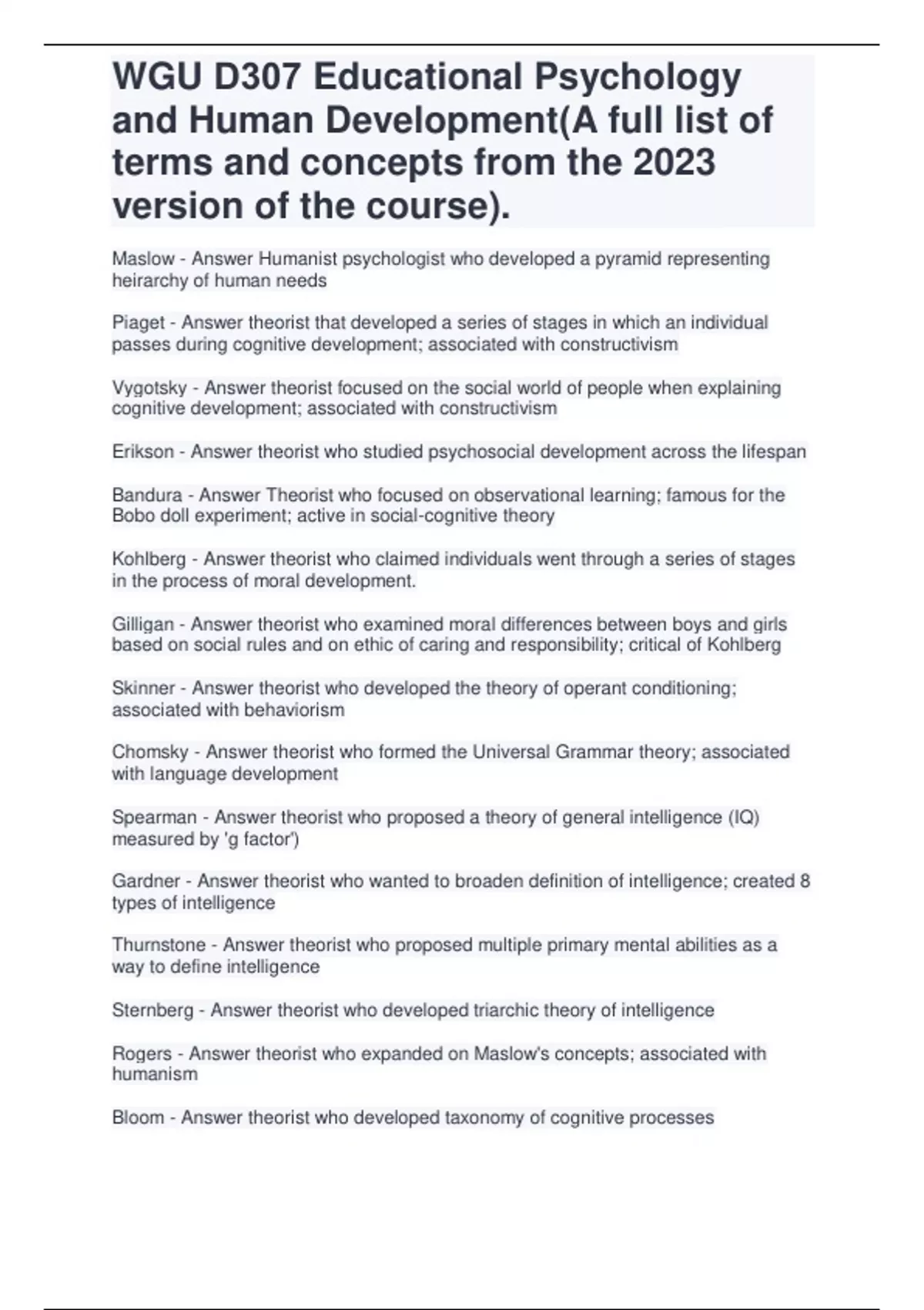 WGU D307 Educational Psychology and Human Development(A full list of terms and concepts from the 2023 version of the course).