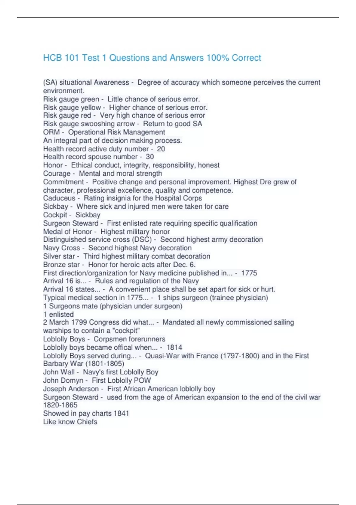 HCB 101 Test 1 Questions and Answers 100% Correct (SA) situational Awareness - Degree of accuracy which someone perceives the current environment. Risk gauge green - Little chance of serious error. Risk gauge yellow - Higher chance of serious error. Risk gauge red - Very high chance of serious error Risk gauge swooshing arrow - Return to good SA ORM - Operational Risk Management An integral part of decision making process. Health record active duty number - 20 Health record spouse number - 30 Honor - Ethical conduct, integrity, responsibility, honest Courage - Mental and moral strength Commitment - Positive change and personal improvement. Highest Dre grew of character, professional excellence, quality and competence. Caduceus - Rating insignia for the Hospital Corps Sickbay - Where sick and injured men were taken for care Cockpit - Sickbay Surgeon Steward - First enlisted rate requiring specific qualification Medal of Honor - Highest military honor Distinguished service cross (DSC) - Second highest army decoration Navy Cross - Second highest Navy decoration Silver star - Third highest military combat decoration Bronze star - Honor for heroic acts after Dec. 6. First direction/organization for Navy medicine published in... - 1775 Arrival 16 is... - Rules and regulation of the Navy Arrival 16 states... - A convenient place shall be set apart for sick or hurt. Typical medical section in 1775... - 1 ships surgeon (trainee physician) 1 Surgeons mate (physician under surgeon) 1 enlisted 2 March 1799 Congress did what... - Mandated all newly commissioned sailing warships to contain a "cockpit" Loblolly Boys - Corpsmen forerunners Loblolly boys became offical when... - 1814 Loblolly Boys served during... - Quasi-War with France () and in the First Barbary War () John Wall - Navy's first Loblolly Boy John Domyn - First Loblolly POW Joseph Anderson - First African American loblolly boy Surgeon Steward - used from the age of American expansion to the end of the civil war Showed in pay charts 1841 Like know Chiefs