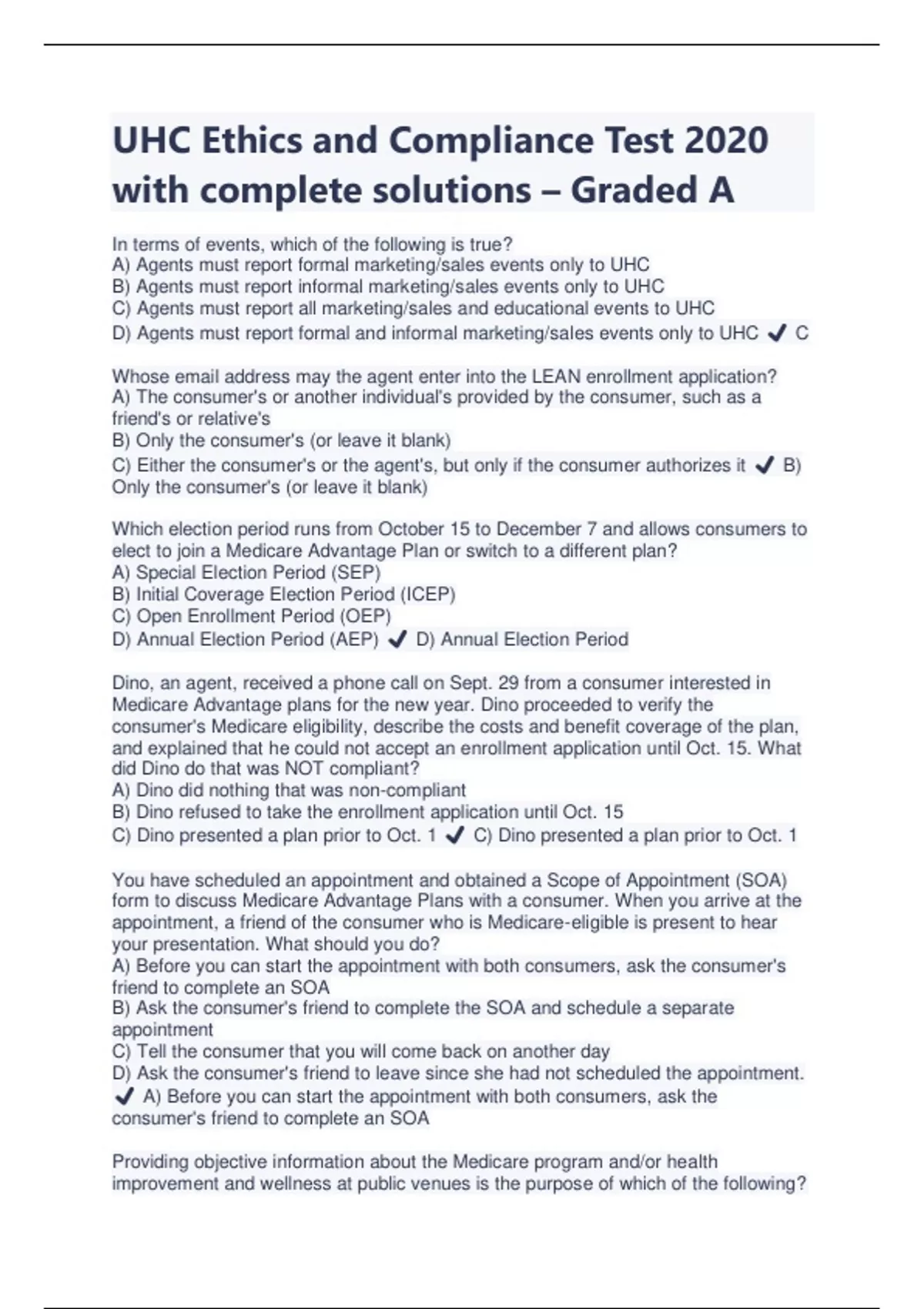 UHC Ethics and Compliance Test 2020 with complete solutions – Graded A In terms of events, which of the following is true? A) Agents must report formal marketing/sales events only to UHC B) Agents must report informal marketing/sales events only to UHC C) Agents must report all marketing/sales and educational events to UHC D) Agents must report formal and informal marketing/sales events only to UHC ️ C Whose email address may the agent enter into the LEAN enrollment application? A) The consumer's or another individual's provided by the consumer, such as a friend's or relative's B) Only the consumer's (or leave it blank) C) Either the consumer's or the agent's, but only if the consumer authorizes it ️ B) Only the consumer's (or leave it blank) Which election period runs from October 15 to December 7 and allows consumers to elect to join a Medicare Advantage Plan or switch to a different plan? A) Special Election Period (SEP) B) Initial Coverage Election Period (ICEP) C) Open Enrollment Period (OEP) D) Annual Election Period (AEP) ️ D) Annual Election Period Dino, an agent, received a phone call on Sept. 29 from a consumer interested in Medicare Advantage plans for the new year. Dino proceeded to verify the consumer's Medicare eligibility, describe the costs and benefit coverage of the plan, and explained that he could not accept an enrollment application until Oct. 15. What did Dino do that was NOT compliant? A) Dino did nothing that was non-compliant B) Dino refused to take the enrollment application until Oct. 15 C) Dino presented a plan prior to Oct. 1 ️ C) Dino presented a plan prior to Oct. 1 You have scheduled an appointment and obtained a Scope of Appointment (SOA) form to discuss Medicare Advantage Plans with a consumer. When you arrive at the appointment, a friend of the consumer who is Medicare-eligible is present to hear your presentation. What should you do? A) Before you can start the appointment with both consumers, ask the consumer's friend to complete an SOA B) Ask the consumer's friend to complete the SOA and schedule a separate appointment C) Tell the consumer that you will come back on another day D) Ask the consumer's friend to leave since she had not scheduled the appointment. ️ A) Before you can start the appointment with both consumers, ask the consumer's friend to complete an SOA