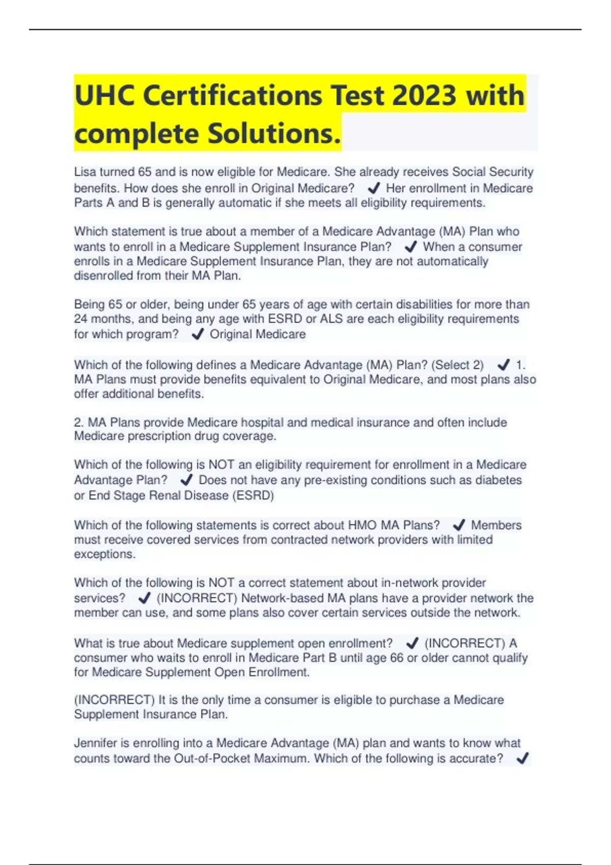 UHC Certifications Test 2023 with complete Solutions | Latest 2023/2024. Lisa turned 65 and is now eligible for Medicare. She already receives Social Security benefits. How does she enroll in Original Medicare? ️ Her enrollment in Medicare Parts A and B is generally automatic if she meets all eligibility requirements. Which statement is true about a member of a Medicare Advantage (MA) Plan who wants to enroll in a Medicare Supplement Insurance Plan? ️ When a consumer enrolls in a Medicare Supplement Insurance Plan, they are not automatically disenrolled from their MA Plan. Being 65 or older, being under 65 years of age with certain disabilities for more than 24 months, and being any age with ESRD or ALS are each eligibility requirements for which program? ️ Original Medicare Which of the following defines a Medicare Advantage (MA) Plan? (Select 2) ️ 1. MA Plans must provide benefits equivalent to Original Medicare, and most plans also offer additional benefits. 2. MA Plans provide Medicare hospital and medical insurance and often include Medicare prescription drug coverage. Which of the following is NOT an eligibility requirement for enrollment in a Medicare Advantage Plan? ️ Does not have any pre-existing conditions such as diabetes or End Stage Renal Disease (ESRD) Which of the following statements is correct about HMO MA Plans? ️ Members must receive covered services from contracted network providers with limited exceptions. Which of the following is NOT a correct statement about in-network provider services? ️ (INCORRECT) Network-based MA plans have a provider network the member can use, and some plans also cover certain services outside the network. What is true about Medicare supplement open enrollment? ️ (INCORRECT) A consumer who waits to enroll in Medicare Part B until age 66 or older cannot qualify for Medicare Supplement Open Enrollment. (INCORRECT) It is the only time a consumer is eligible to purchase a Medicare Supplement Insurance Plan. Jennifer is enrolling into a Medicare Advantage (MA) plan and wants to know what counts toward the Out-of-Pocket Maximum. Which of the following is accurate?