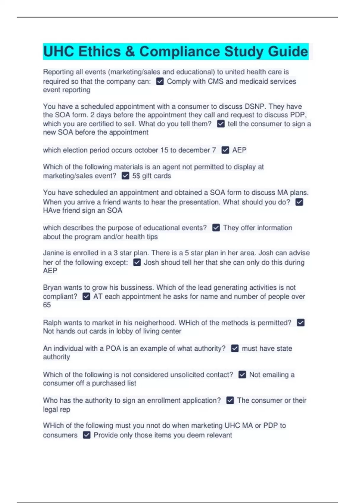 UHC Ethics & Compliance Study Guide | Latest 2023/2024 Reporting all events (marketing/sales and educational) to united health care is required so that the company can: ☑️ Comply with CMS and medicaid services event reporting You have a scheduled appointment with a consumer to discuss DSNP. They have the SOA form. 2 days before the appointment they call and request to discuss PDP, which you are certified to sell. What do you tell them? ☑️ tell the consumer to sign a new SOA before the appointment which election period occurs october 15 to december 7 ☑️ AEP Which of the following materials is an agent not permitted to display at marketing/sales event? ☑️ 5$ gift cards You have scheduled an appointment and obtained a SOA form to discuss MA plans. When you arrive a friend wants to hear the presentation. What should you do? ☑️ HAve friend sign an SOA which describes the purpose of educational events? ☑️ They offer information about the program and/or health tips Janine is enrolled in a 3 star plan. There is a 5 star plan in her area. Josh can advise her of the following except: ☑️ Josh shoud tell her that she can only do this during AEP Bryan wants to grow his bussiness. Which of the lead generating activities is not compliant? ☑️ AT each appointment he asks for name and number of people over 65 Ralph wants to market in his neigherhood. WHich of the methods is permitted? ☑️ Not hands out cards in lobby of living center An individual with a POA is an example of what authority? ☑️ must have state authority Which of the following is not considered unsolicited contact? ☑️ Not emailing a consumer off a purchased list Who has the authority to sign an enrollment application? ☑️ The consumer or their legal rep WHich of the following must you nnot do when marketing UHC MA or PDP to consumers ☑️ Provide only those items you deem relevant