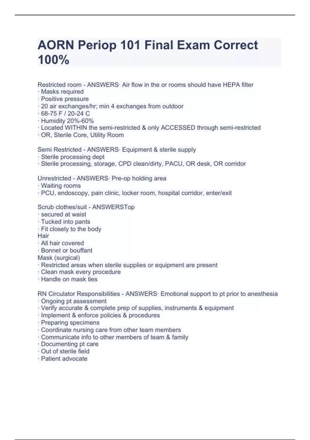 Restricted room - ANSWERS· Air flow in the or rooms should have HEPA filter · Masks required · Positive pressure · 20 air exchanges/hr; min 4 exchanges from outdoor · 68-75 F / 20-24 C · Humidity 20%-60% · Located WITHIN the semi-restricted & only ACCESSED through semi-restricted · OR, Sterile Core, Utility Room Semi Restricted - ANSWERS· Equipment & sterile supply · Sterile processing dept · Sterile processing, storage, CPD clean/dirty, PACU, OR desk, OR corridor Unrestricted - ANSWERS· Pre-op holding area · Waiting rooms · PCU, endoscopy, pain clinic, locker room, hospital corridor, enter/exit Scrub clothes/suit - ANSWERSTop · secured at waist · Tucked into pants · Fit closely to the body Hair · All hair covered · Bonnet or bouffant Mask (surgical) · Restricted areas when sterile supplies or equipment are present · Clean mask every procedure · Handle on mask ties RN Circulator Responsibilities - ANSWERS· Emotional support to pt prior to anesthesia · Ongoing pt assessment · Verify accurate & complete prep of supplies, instruments & equipment · Implement & enforce policies & procedures · Preparing specimens · Coordinate nursing care from other team members · Communicate info to other members o
