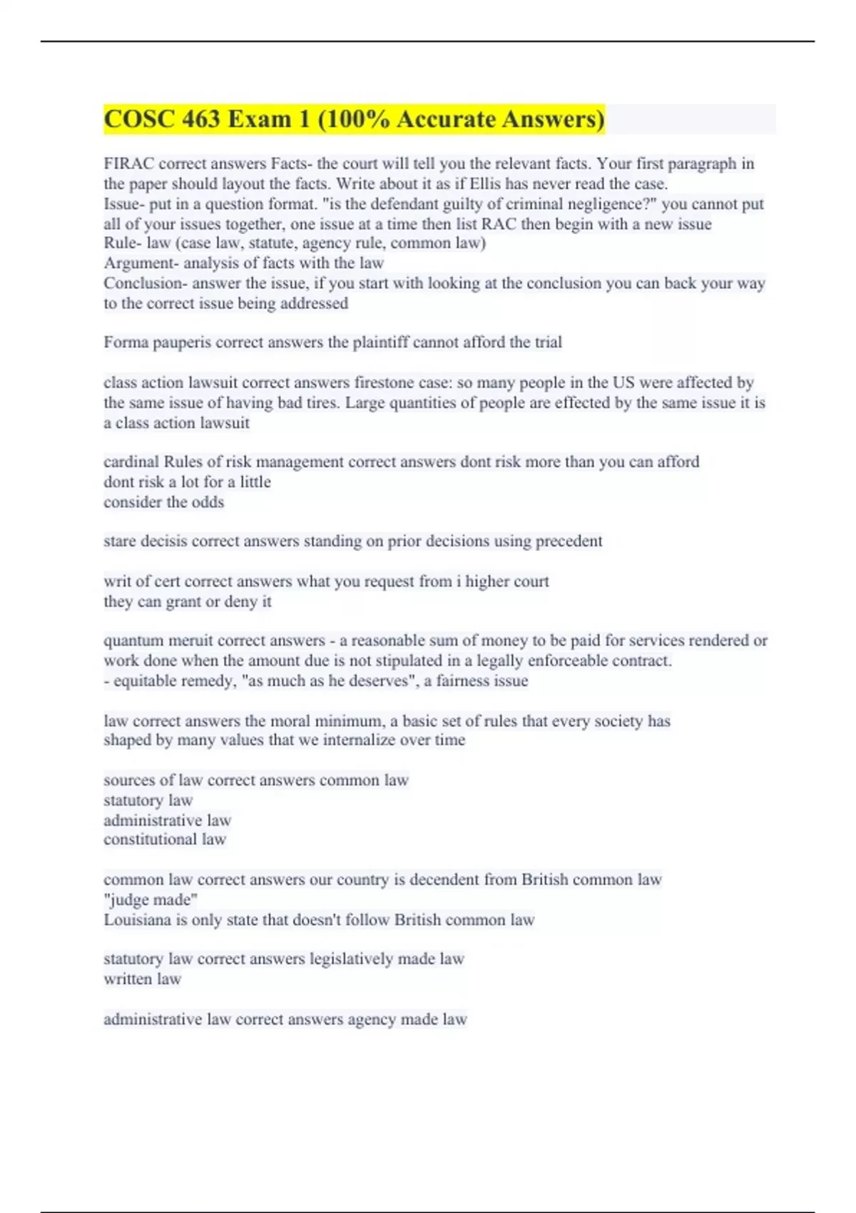 FIRAC correct answers Facts- the court will tell you the relevant facts. Your first paragraph in the paper should layout the facts. Write about it as if Ellis has never read the case. Issue- put in a question format. "is the defendant guilty of criminal negligence?" you cannot put all of your issues together, one issue at a time then list RAC then begin with a new issue Rule- law (case law, statute, agency rule, common law) Argument- analysis of facts with the law Conclusion- answer the issue, if you start with looking at the conclusion you can back your way to the correct issue being addressed Forma pauperis correct answers the plaintiff cannot afford the trial class action lawsuit correct answers firestone case: so many people in the US were affected by the same issue of having bad tires. Large quantities of people are effected by the same issue it is a class action lawsuit cardinal Rules of risk management correct answers dont risk more than you can afford dont risk a lot for a little consider the odds stare decisis correct answers standing on prior decisions using precedent writ of cert correct answers what you request from i higher court they can grant or deny it quantum meruit correct answers - a reasonable sum of money to be paid for services rendered or work done when the amount due is not stipulated in a legally enforceable contract. - equitable remedy, "as much as he deserves", a fairness issue law correct answers the moral minimum, a basic set of rules that every society has shaped by many values that we internalize over time sources of law correct answers common law statutory law administrative law constitutional law common law correct answers our country is decendent from British common law "judge made" Louisiana is only state that doesn't follow British common law statutory law correct answers legislatively made law written law administrative law correct answers agency made law