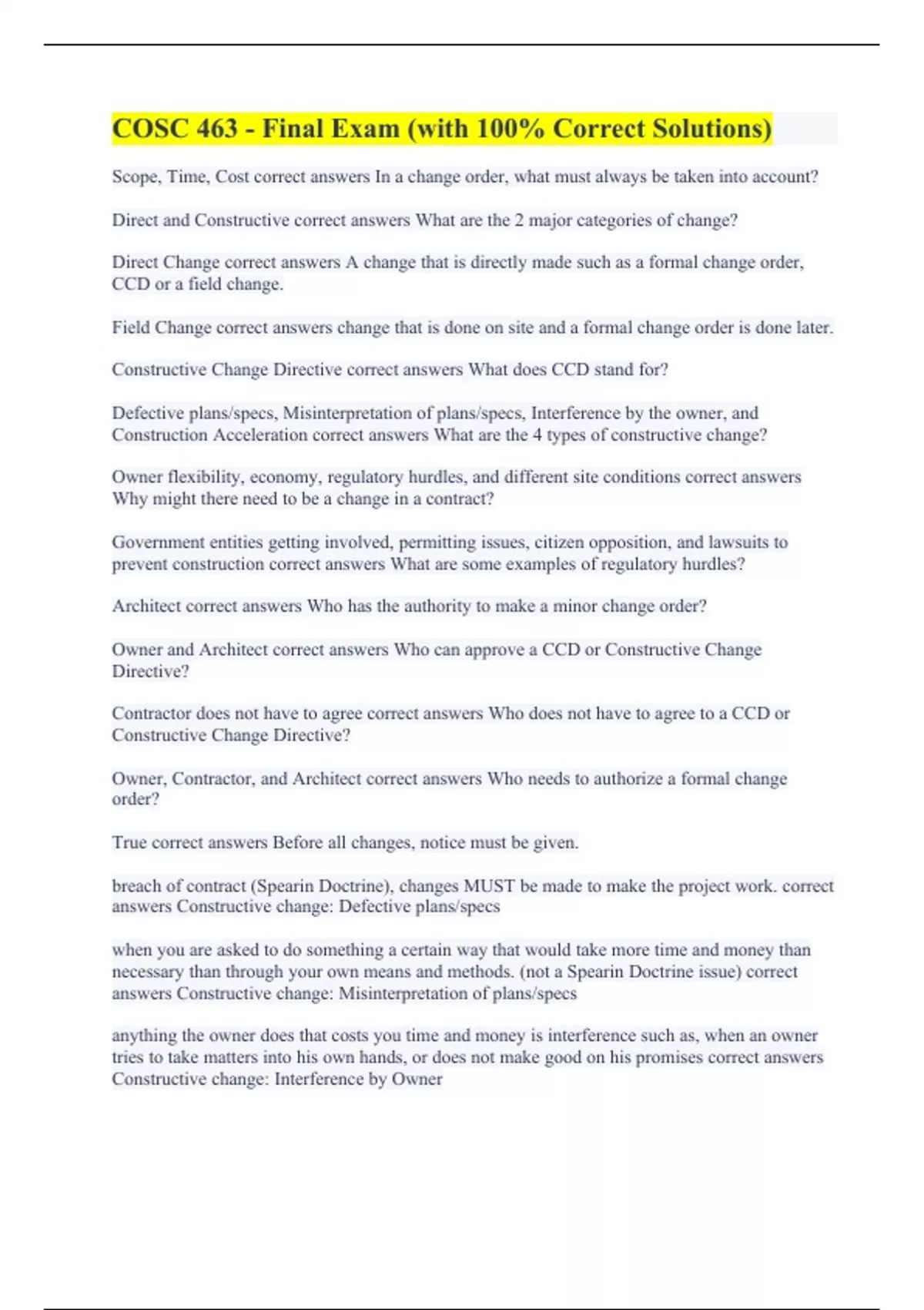 Scope, Time, Cost correct answers In a change order, what must always be taken into account? Direct and Constructive correct answers What are the 2 major categories of change? Direct Change correct answers A change that is directly made such as a formal change order, CCD or a field change. Field Change correct answers change that is done on site and a formal change order is done later. Constructive Change Directive correct answers What does CCD stand for? Defective plans/specs, Misinterpretation of plans/specs, Interference by the owner, and Construction Acceleration correct answers What are the 4 types of constructive change? Owner flexibility, economy, regulatory hurdles, and different site conditions correct answers Why might there need to be a change in a contract? Government entities getting involved, permitting issues, citizen opposition, and lawsuits to prevent construction correct answers What are some examples of regulatory hurdles? Architect correct answers Who has the authority to make a minor change order? Owner and Architect correct answers Who can approve a CCD or Constructive Change Directive? Contractor does not have to agree correct answers Who does not have to agree to a CCD or Constructive Change Directive? Owner, Contractor, and Architect correct answers Who needs to authorize a formal change order? True correct answers Before all changes, notice must be given. breach of contract (Spearin Doctrine), changes MUST be made to make the project work. correct answers Constructive change: Defective plans/specs when you are asked to do something a certain way that would take more time and money than necessary than through your own means and methods. (not a Spearin Doctrine issue) correct answers Constructive change: Misinterpretation of plans/specs anything the owner does that costs you time and money is interference such as, when an owner tries to take matters into his own hands, or does not make good on his promises correct answers Constructive change: Interference by Owner