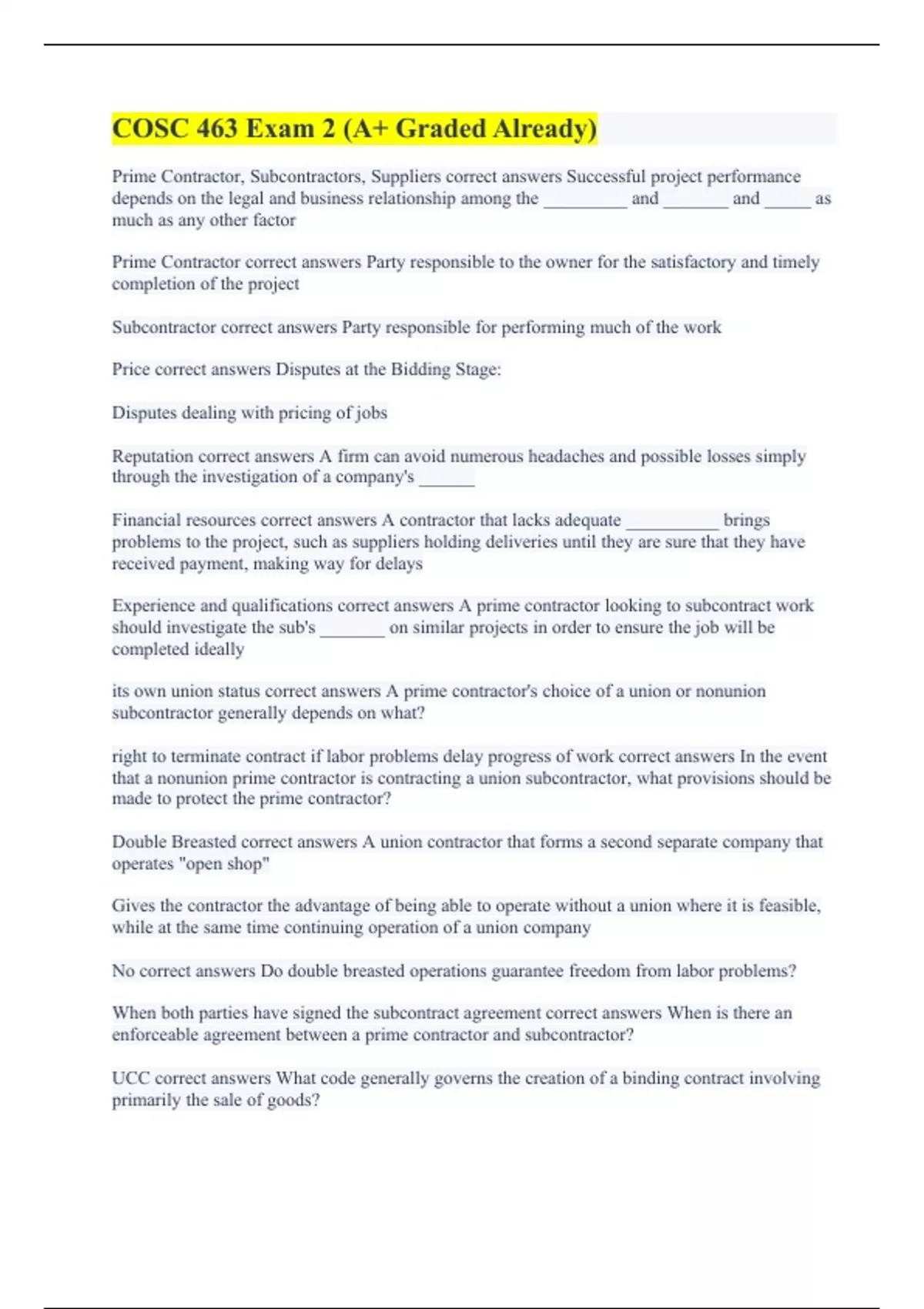 Prime Contractor, Subcontractors, Suppliers correct answers Successful project performance depends on the legal and business relationship among the _________ and _______ and _____ as much as any other factor Prime Contractor correct answers Party responsible to the owner for the satisfactory and timely completion of the project Subcontractor correct answers Party responsible for performing much of the work Price correct answers Disputes at the Bidding Stage: Disputes dealing with pricing of jobs Reputation correct answers A firm can avoid numerous headaches and possible losses simply through the investigation of a company's ______ Financial resources correct answers A contractor that lacks adequate __________ brings problems to the project, such as suppliers holding deliveries until they are sure that they have received payment, making way for delays Experience and qualifications correct answers A prime contractor looking to subcontract work should investigate the sub's _______ on similar projects in order to ensure the job will be completed ideally its own union status correct answers A prime contractor's choice of a union or nonunion subcontractor generally depends on what? right to terminate contract if labor problems delay progress of work correct answers In the event that a nonunion prime contractor is contracting a union subcontractor, what provisions should be made to protect the prime contractor? Double Breasted correct answers A union contractor that forms a second separate company that operates "open shop" Gives the contractor the advantage of being able to operate without a union where it is feasible, while at the same time continuing operation of a union company No correct answers Do double breasted operations guarantee freedom from labor problems? When both parties have signed the subcontract agreement correct answers When is there an enforceable agreement between a prime contractor and subcontractor? UCC correct answers What code generally governs the creation of a binding contract involving primarily the sale of goods?