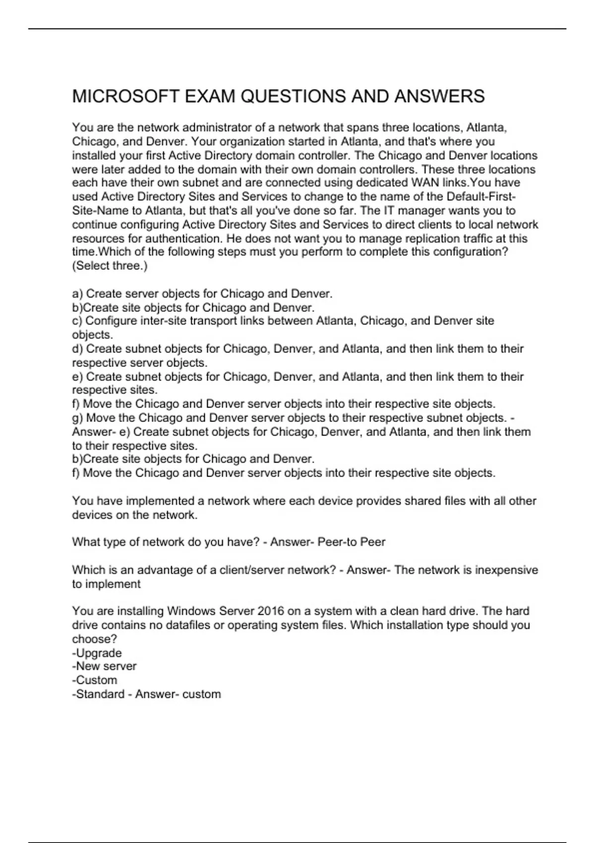 You are the network administrator of a network that spans three locations, Atlanta, Chicago, and Denver. Your organization started in Atlanta, and that's where you installed your first Active Directory domain controller. The Chicago and Denver locations were later added to the domain with their own domain controllers. These three locations each have their own subnet and are connected using dedicated WAN links.You have used Active Directory Sites and Services to change to the name of the Default-First-Site-Name to Atlanta, but that's all you've done so far. The IT manager wants you to continue configuring Active Directory Sites and Services to direct clients to local network resources for authentication. He does not want you to manage replication traffic at this time.Which of the following steps must you perform to complete this configuration? (Select three.) a) Create server objects for Chicago and Denver. b)Create site objects for Chicago and Denver. c) Configure inter-site transport links between Atlanta, Chicago, and Denver site objects. d) Create subnet objects for Chicago, Denver, and Atlanta, and then link them to their respective server objects. e) Create subnet objects for Chicago, Denver, and Atlanta, and then link them to their respective sites. f) Move the Chicago and Denver server objects into their respective site objects. g) Move the Chicago and Denver server objects to their respective subnet objects. - Answer- e) Create subnet objects for Chicago, Denver, and Atlanta, and then link them to their respective sites. b)Create site objects for Chicago and Denver. f) Move the Chicago and Denver server objects into their respective site objects. You have implemented a network where each device provides shared files with all other devices on the network. What type of network do you have? - Answer- Peer-to Peer Which is an advantage of a client/server network? - Answer- The network is inexpensive to implement You are installing Windows Server 2016 on a system with a clean hard drive. The hard drive contains no datafiles or operating system files. Which installation type should you choose? -Upgrade -New server -Custom -Standard - Answer- custom