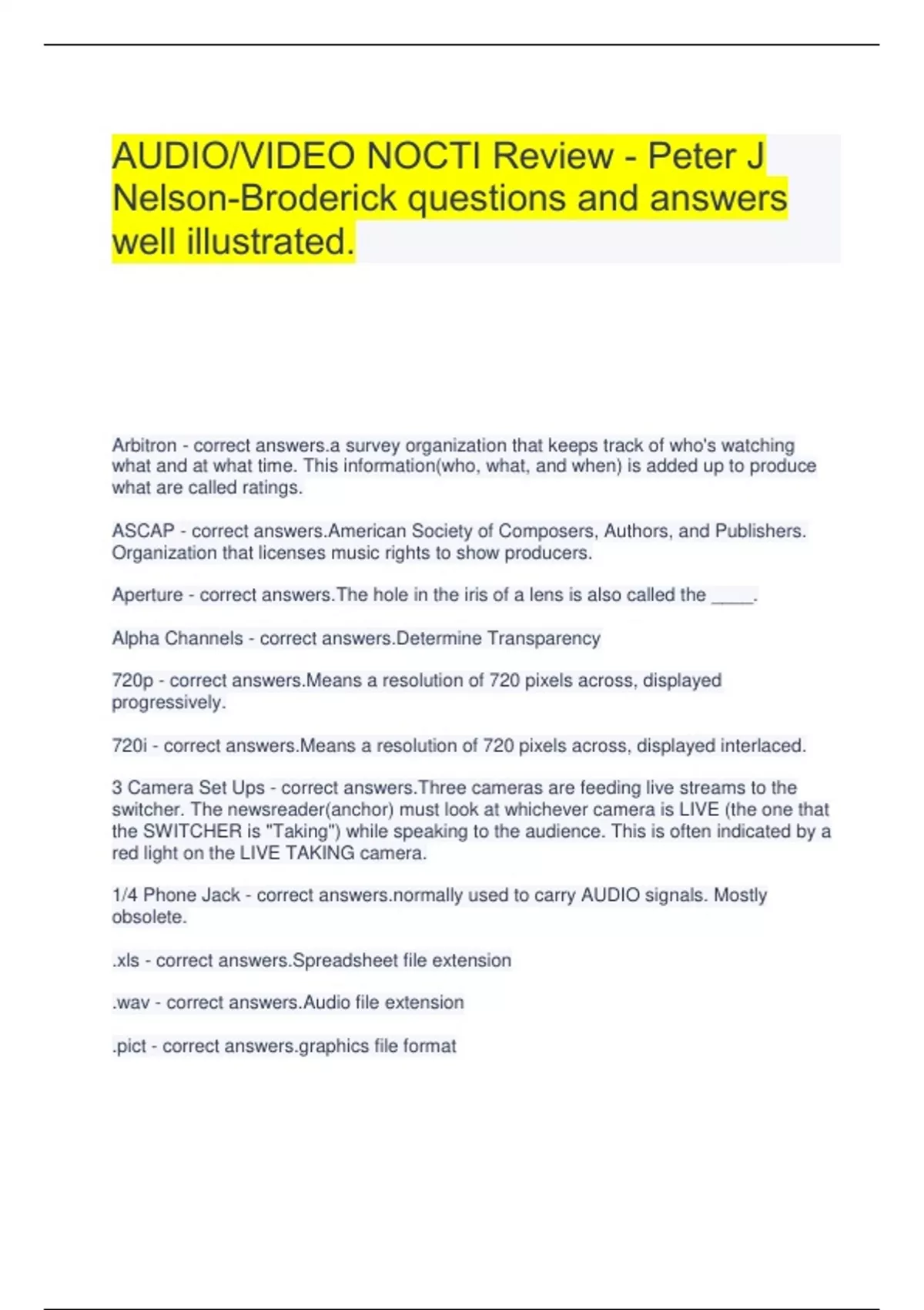AUDIO/VIDEO NOCTI Review - Peter J Nelson-Broderick questions and answers well illustrated. Arbitron - correct answers.a survey organization that keeps track of who's watching what and at what time. This information(who, what, and when) is added up to produce what are called ratings. ASCAP - correct answers.American Society of Composers, Authors, and Publishers. Organization that licenses music rights to show producers. Aperture - correct answers.The hole in the iris of a lens is also called the ____. Alpha Channels - correct answers.Determine Transparency 720p - correct answers.Means a resolution of 720 pixels across, displayed progressively. 720i - correct answers.Means a resolution of 720 pixels across, displayed interlaced. 3 Camera Set Ups - correct answers.Three cameras are feeding live streams to the switcher. The newsreader(anchor) must look at whichever camera is LIVE (the one that the SWITCHER is "Taking") while speaking to the audience. This is often indicated by a red light on the LIVE TAKING camera. 1/4 Phone Jack - correct lly used to carry AUDIO signals. Mostly obsolete. .xls - correct answers.Spreadsheet file extension .wav - correct answers.Audio file extension .pict - correct ics file format .mpeg - correct answers.A movie format determined by the Moving Picture Experts Group .mov - correct answers.Video file extension .jpg - correct a lossy form of compression meaning that some original image information is lost and cannot be restored, possibly affecting image quality. Means JOINT PHOTOGRAPHIC EXPERTS GROUP) .gif - correct answers.Graphics Interchange Format .bmp - correct answers.Bitmap auditions - correct determine skills/capabilities of a performer. Chrominance - correct s to color. If you are KEYING a color (such as green) it is called a ______ KEY. Bidirectional microphone - correct phone that picks up sound from two opposite directions Charged Coupled Device (CCD) - correct answers.The most common light-sensitive imaging surface on a video camera is the ___. It is divided up into a large number of light-sensitive small areas (known as pixels) which can be used to build up an image of the scene of interest. In short, it is the light sensitive IMAGING SURFACE, inside the camera where the image is formed. Light is converted into electrical energy. CCU (Camera Control Unit) - correct ates all the elements of the camera signal. (Such as focus, exposure, white balance and color balance). Synchronizes all cameras in a 3 Camera Setup. CG Operator - correct answers.Person whose responsibilities include creating graphics to be keyed or superimposed on the screen. Cardioid Mic - correct ds in a heart-shaped pick-up pattern. Sound is picked up mostly from the front, but to a lesser extent the sides as well. Capturing - correct ferring digital video from tape or SD card to a hard drive. Bus - correct answers.The main concept of a professional SWITCHER or vision mixer is the ___, basically a row of buttons with each button representing a video source. BNC Cable - correct lly used to carry VIDEO signals. BNC - correct answers.Often referred to as triax for short, is a type of electrical cable similar to coaxial cable, but with the addition of an extra layer of insulation and a second conducting sheath. BMI - correct answers.(Broadcast Music Inc.) Organization that licenses music rights to show producers. Blacked Videotape - correct space with timecode applied to enable frame accuracy for insert shots Binary Codes - correct answers.In digital media, sound and light are converted into ______ ____. Barn doors - correct nical flaps on the sides of lighting instruments that open and close on hinges to control the shape of the light and where it falls. They are like mounted flags. Background Music - correct during a dramatic scene to underscore the mood usually does not contain lyrics for these will distract and compete with the spoken dialogue. CU - correct answers.Script abbreviation for Close-up. Crossfading - correct answers.In audio, fading one sound down, while simultaneously fading up another sound to replace it is called ___________. In picture, it is called _____-__________. CPB - correct answers.Corporation for Public Broadcasting is a nonprofit that ensures universal access to non-commercial high-quality programming and telecommunications services. Crawl - correct answers.a title moving along the botton of the screen from Left to Right announcing Bulletins, Newsflashes and Weather Warnings Component Video - correct d Y, R-Y, B-Y. best quality video signal Completed Script - correct answers.What is needed to cast the film, decide what equipment is needed, select the location of sets, budget the production, and schedule the film shooting? Concept/Program Proposal - correct answers.Includes, but not be limited to, basic message, intended audience, equipment needed, target shooting date, and sample shooting locations; information that conveys the general overview and "feel" for an idea.