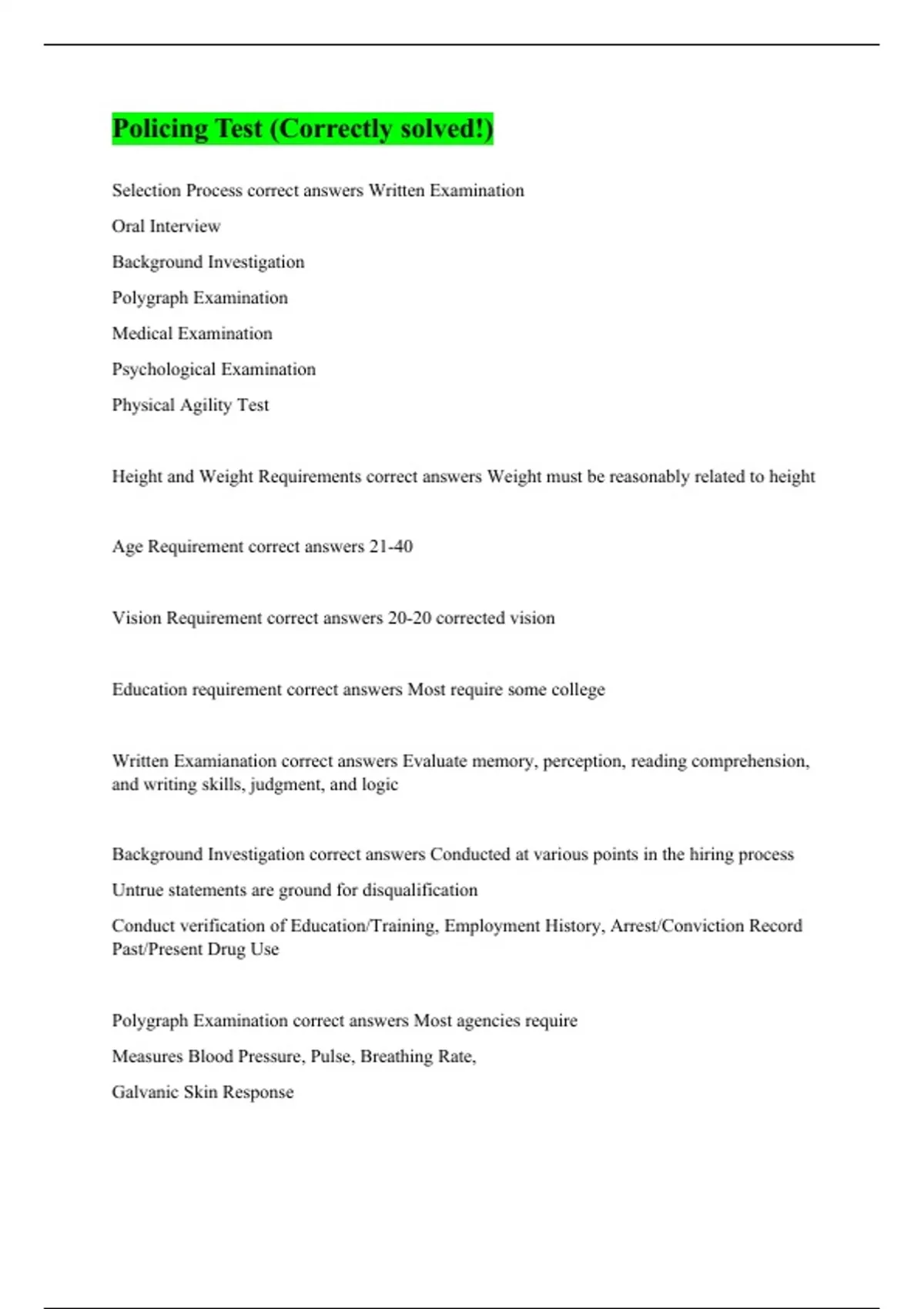 Selection Process correct answers Written Examination Oral Interview Background Investigation Polygraph Examination Medical Examination Psychological Examination Physical Agility Test Height and Weight Requirements correct answers Weight must be reasonably related to height Age Requirement correct answers 21-40 Vision Requirement correct answers 20-20 corrected vision Education requirement correct answers Most require some college Written Examianation correct answers Evaluate memory, perception, reading comprehension, and writing skills, judgment, and logic Background Investigation correct answers Conducted at various points in the hiring process Untrue statements are ground for disqualification Conduct verification of Education/Training, Employment History, Arrest/Conviction Record Past/Present Drug Use Polygraph Examination correct answers Most agencies require Measures Blood Pressure, Pulse, Breathing Rate, Galvanic Skin Response