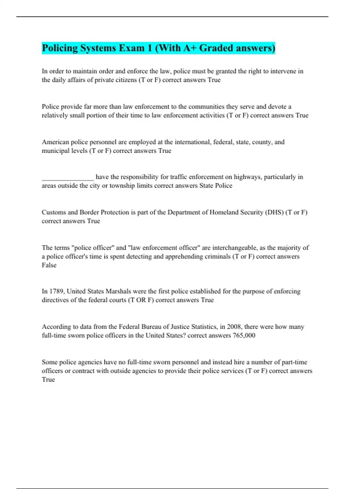 In order to maintain order and enforce the law, police must be granted the right to intervene in the daily affairs of private citizens (T or F) correct answers True Police provide far more than law enforcement to the communities they serve and devote a relatively small portion of their time to law enforcement activities (T or F) correct answers True American police personnel are employed at the international, federal, state, county, and municipal levels (T or F) correct answers True _______________ have the responsibility for traffic enforcement on highways, particularly in areas outside the city or township limits correct answers State Police Customs and Border Protection is part of the Department of Homeland Security (DHS) (T or F) correct answers True The terms "police officer" and "law enforcement officer" are interchangeable, as the majority of a police officer's time is spent detecting and apprehending criminals (T or F) correct answers False In 1789, United States Marshals were the first police established for the purpose of enforcing directives of the federal courts (T OR F) correct answers True According to data from the Federal Bureau of Justice Statistics, in 2008, there were how many full-time sworn police officers in the United States? correct answers 765,000 Some police agencies have no full-time sworn personnel and instead hire a number of part-time officers or contract with outside agencies to provide their police services (T or F) correct answers True