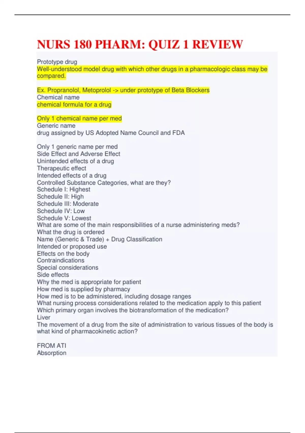 NURS 180 PHARM: QUIZ 1 REVIEW (A+ Guaranteed) Prototype drug correct answers Well-understood model drug with which other drugs in a pharmacologic class may be compared. Ex. Propranolol, Metoprolol - under prototype of Beta Blockers Chemical name correct answers chemical formula for a drug Only 1 chemical name per med Generic name correct answers drug assigned by US Adopted Name Council and FDA Only 1 generic name per med Side Effect and Adverse Effect correct answers Unintended effects of a drug Therapeutic effect correct answers Intended effects of a drug Controlled Substance Categories, what are they? correct answers Schedule I: Highest Schedule II: High Schedule III: Moderate Schedule IV: Low Schedule V: Lowest What are some of the main responsibilities of a nurse administering meds? correct answers What the drug is ordered Name (Generic & Trade) + Drug Classification Intended or proposed use Effects on the body Contraindications Special considerations Side effects Why the med is appropriate for patient How med is supplied by pharmacy How med is to be administered, including dosage ranges What nursing process considerations related to the medication apply to this patient Which primary organ involves the biotransformation of the medication? correct answers Liver The movement of a drug from the site of administration to various tissues of the body is what kind of pharmacokinetic action? FROM ATI correct answers Absorption