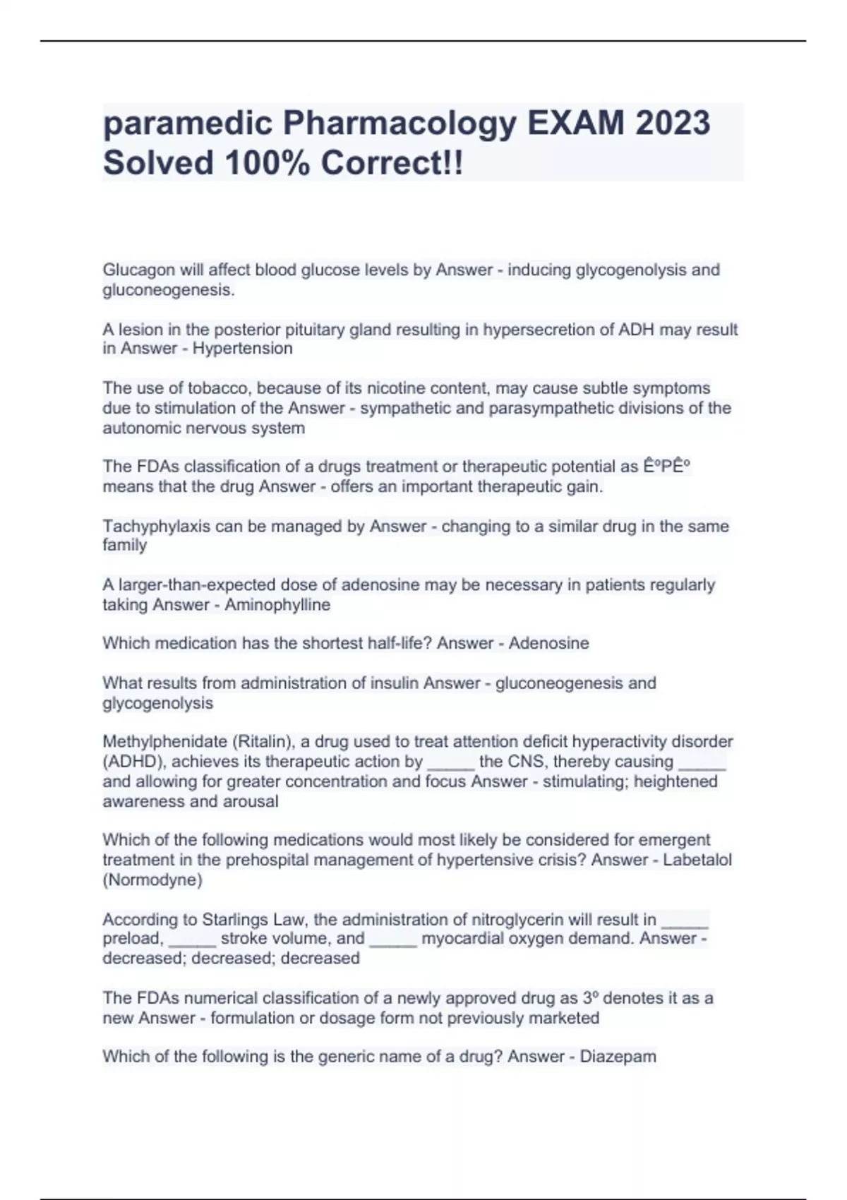 paramedic Pharmacology EXAM 2023 Solved 100% Correct!!