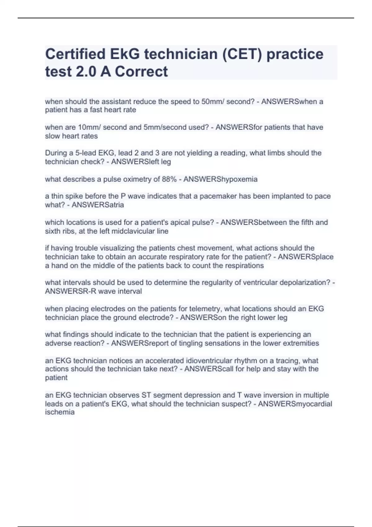 when should the assistant reduce the speed to 50mm/ second? - ANSWERSwhen a patient has a fast heart rate when are 10mm/ second and 5mm/second used? - ANSWERSfor patients that have slow heart rates During a 5-lead EKG, lead 2 and 3 are not yielding a reading, what limbs should the technician check? - ANSWERSleft leg what describes a pulse oximetry of 88% - ANSWERShypoxemia a thin spike before the P wave indicates that a pacemaker has been implanted to pace what? - ANSWERSatria which locations is used for a patient's apical pulse? - ANSWERSbetween the fifth and sixth ribs, at the left midclavicular line if having trouble visualizing the patients chest movement, what actions should the technician take to obtain an accurate respiratory rate for the patient? - ANSWERSplace a hand on the middle of the patients back to count the respirations what intervals should be used to determine the regularity of ventricular depolarization? - ANSWERSR-R wave interval when placing electrodes on the patients for telemetry, what locations should an EKG technician place the ground electrode? - ANSWERSon the right lower leg what findings should indicate to the technician that the patient is experiencing an adverse reaction? - ANSWERSreport of tingling sensations in the lower extremities an EKG technician notices an accelerated idioventricular rhythm on a tracing, what actions should the technician take next? - ANSWERScall for help and stay with the patient