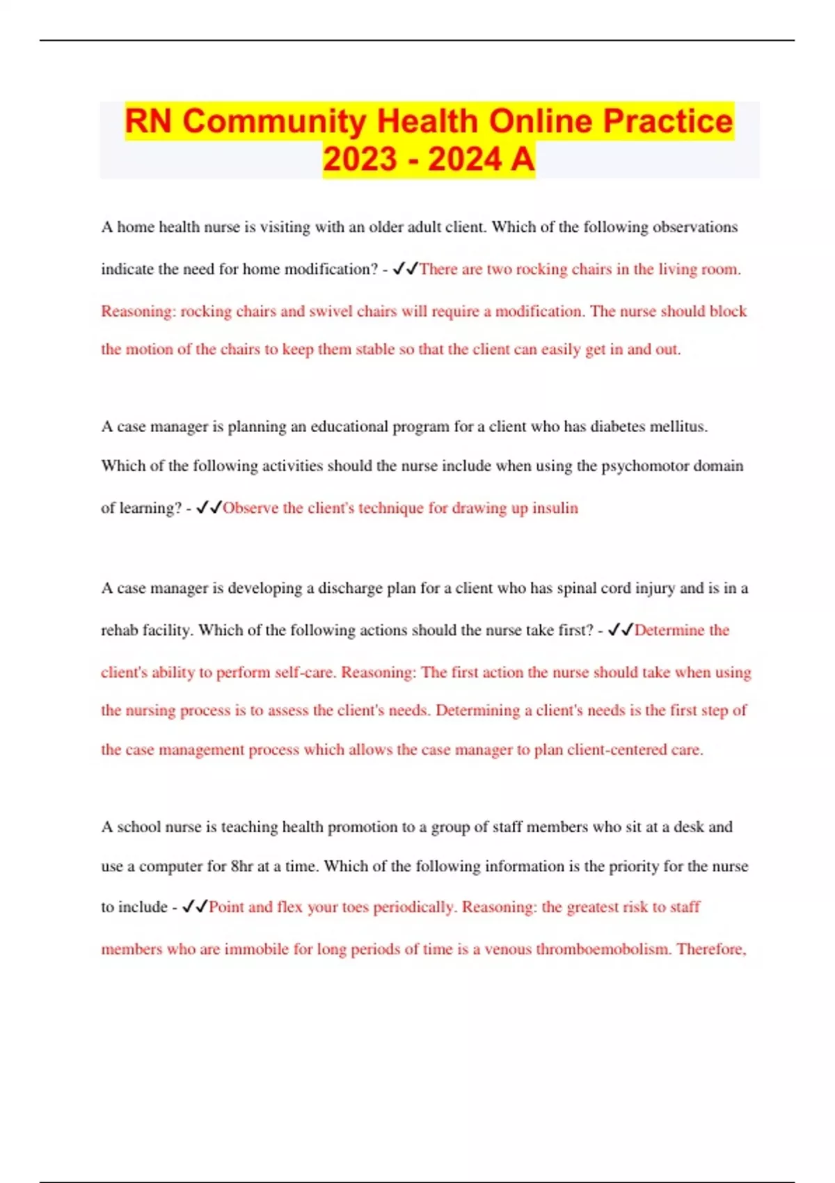 A home health nurse is visiting with an older adult client. Which of the following observations indicate the need for home modification? - There are two rocking chairs in the living room. Reasoning: rocking chairs and swivel chairs will require a modification. The nurse should block the motion of the chairs to keep them stable so that the client can easily get in and out. A case manager is planning an educational program for a client who has diabetes mellitus. Which of the following activities should the nurse include when using the psychomotor domain of learning? - Observe the client's technique for drawing up insulin A case manager is developing a discharge plan for a client who has spinal cord injury and is in a rehab facility. Which of the following actions should the nurse take first? - Determine the client's ability to perform self-care. Reasoning: The first action the nurse should take when using the nursing process is to assess the client's needs. Determining a client's needs is the first step of the case management process which allows the case manager to plan client-centered care. A school nurse is teaching health promotion to a group of staff members who sit at a desk and use a computer for 8hr at a time. Which of the following information is the priority for the nurse to include - Point and flex your toes periodically. Reasoning: the greatest risk to staff members who are immobile for long periods of time is a venous thromboemobolism. Therefore