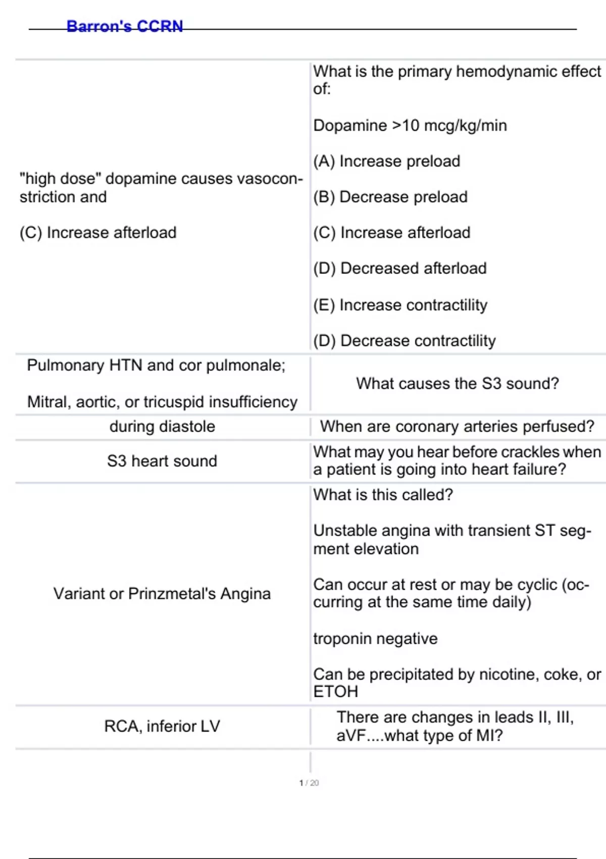 "high dose" dopamine causes vasocon- striction and (C) Increase afterload Pulmonary HTN and cor pulmonale; Mitral, aortic, or tricuspid insufficiency during diastole S3 heart sound Variant or Prinzmetal's Angina RCA, inferior LV What is the primary hemodynamic effect of: Dopamine >10 mcg/kg/min (A) Increase preload (B) Decrease preload (C) Increase afterload (D) Decreased afterload (E) Increase contractility (D) Decrease contractility What causes the S3 sound? When are coronary arteries perfused? What may you hear before crackles when a patient is going into heart failure? What is this called? Unstable angina with transient ST seg- ment elevation Can occur at rest or may be cyclic (oc- curring at the same time daily) troponin negative Can be precipitated by nicotine, coke, or ETOH There are changes in leads II, III, aVF....what type of MI?