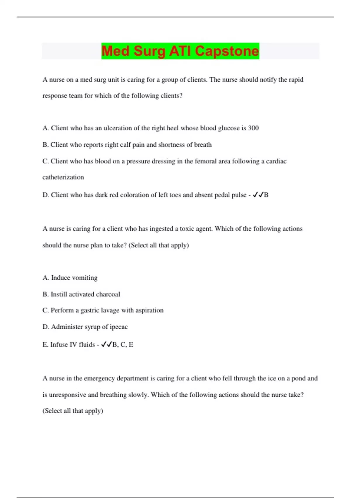 A nurse on a med surg unit is caring for a group of clients. The nurse should notify the rapid response team for which of the following clients? A. Client who has an ulceration of the right heel whose blood glucose is 300 B. Client who reports right calf pain and shortness of breath C. Client who has blood on a pressure dressing in the femoral area following a cardiac catheterization D. Client who has dark red coloration of left toes and absent pedal pulse - B A nurse is caring for a client who has ingested a toxic agent. Which of the following actions should the nurse plan to take? (Select all that apply) A. Induce vomiting B. Instill activated charcoal C. Perform a gastric lavage with aspiration D. Administer syrup of ipecac E. Infuse IV fluids - B, C, E A nurse in the emergency department is caring for a client who fell through the ice on a pond and is unresponsive and breathing slowly. Which of the following actions should the nurse take? (Select all that apply)