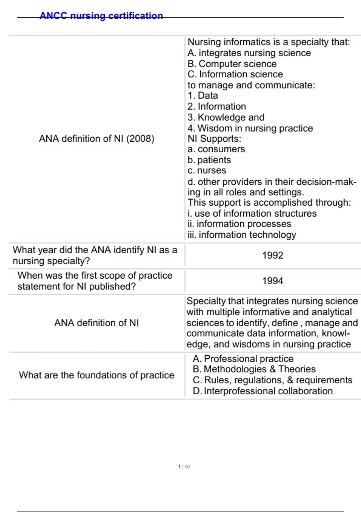ANA definition of NI (2008) What year did the ANA identify NI as a nursing specialty? When was the first scope of practice statement for NI published? ANA definition of NI What are the foundations of practice Nursing informatics is a specialty that: A. integrates nursing science B. Computer science C. Information science to manage and communicate: 1. Data 2. Information 3. Knowledge and 4. Wisdom in nursing practice NI Supports: a. consumers b. patients c. nurses d. other providers in their decision-making in all roles and settings. This support is accomplished through: i. use of information structures ii. information processes iii. information technology 1992 1994 Specialty that integrates nursing science with multiple informative and analytical sciences to identify, define , manage and communicate data information, knowl- edge, and wisdoms in nursing practice A. Professional practice B. Methodologies & Theories C. Rules, regulations, & requirements D. Interprofessional collaboration