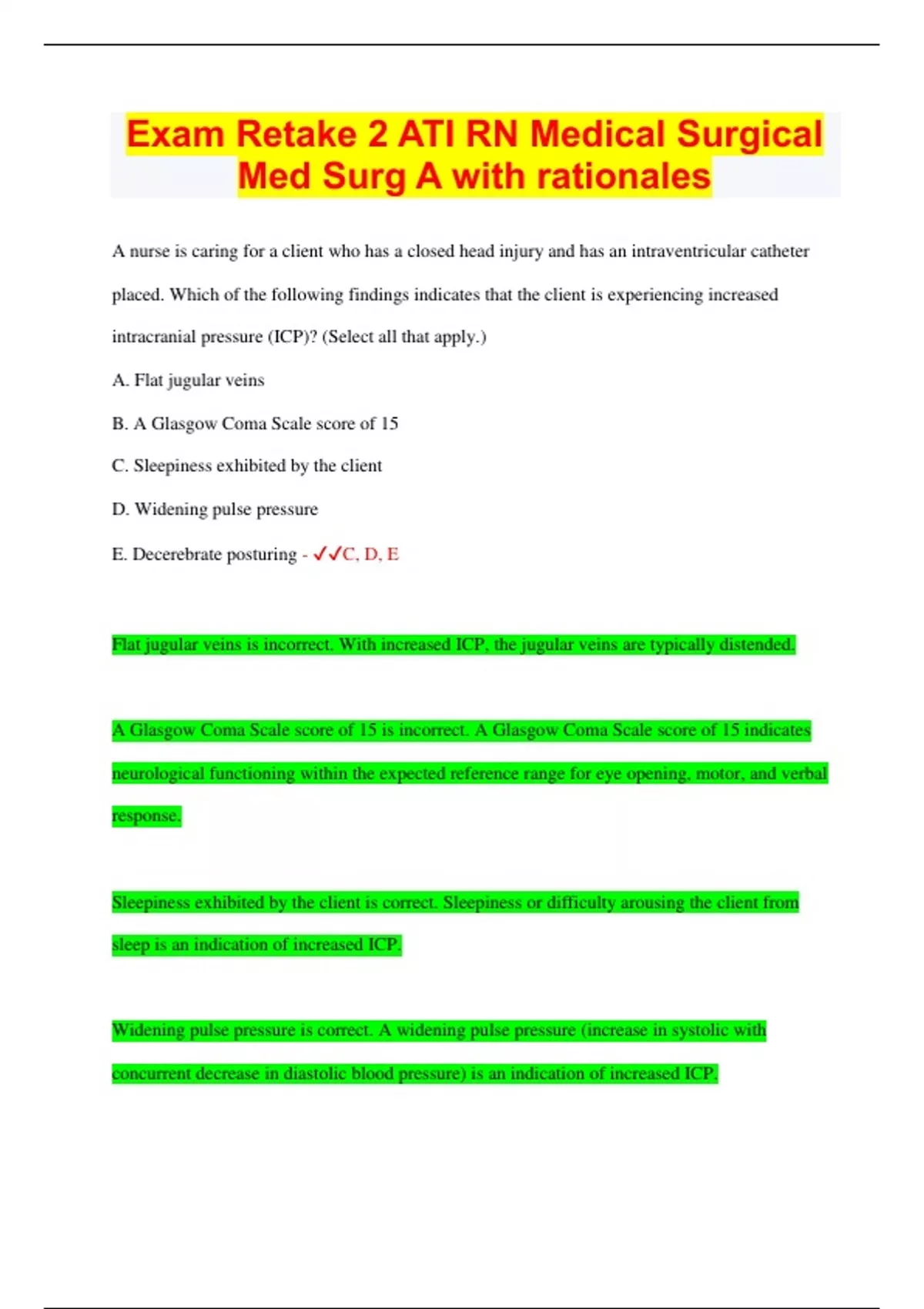 A nurse is caring for a client who has a closed head injury and has an intraventricular catheter placed. Which of the following findings indicates that the client is experiencing increased intracranial pressure (ICP)? (Select all that apply.) A. Flat jugular veins B. A Glasgow Coma Scale score of 15 C. Sleepiness exhibited by the client D. Widening pulse pressure E. Decerebrate posturing - C, D, E Flat jugular veins is incorrect. With increased ICP, the jugular veins are typically distended. A Glasgow Coma Scale score of 15 is incorrect. A Glasgow Coma Scale score of 15 indicates neurological functioning within the expected reference range for eye opening, motor, and verbal response
