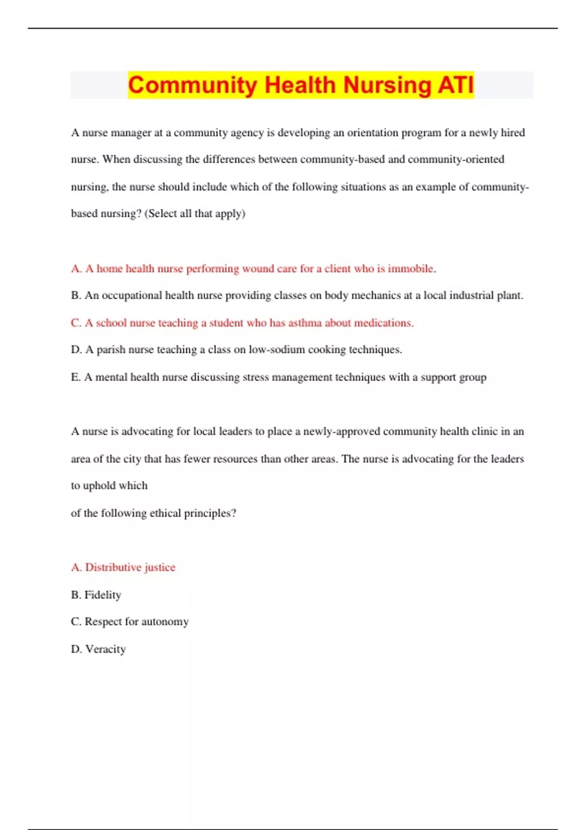 A nurse manager at a community agency is developing an orientation program for a newly hired nurse. When discussing the differences between community-based and community-oriented nursing, the nurse should include which of the following situations as an example of communitybased nursing? (Select all that apply) A. A home health nurse performing wound care for a client who is immobile. B. An occupational health nurse providing classes on body mechanics at a local industrial plant. C. A school nurse teaching a student who has asthma about medications. D. A parish nurse teaching a class on low-sodium cooking techniques. E. A mental health nurse discussing stress management techniques with a support group A nurse is advocating for local leaders to place a newly-approved community health clinic in an area of the city that has fewer resources than other areas. The nurse is advocating for the leaders to uphold which of the following ethical principles? A. Distributive justice B. Fidelity C. Respect for autonomy D. Veracity