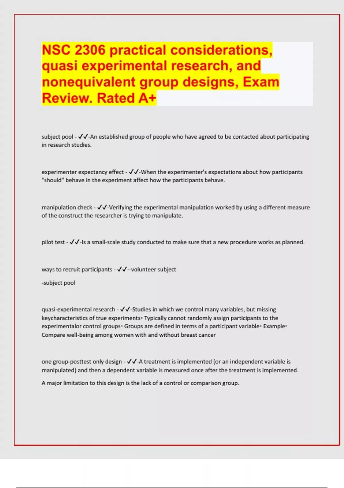 NSC 2306 practical considerations, quasi experimental research, and nonequivalent group designs, Exam Review. Rated A+