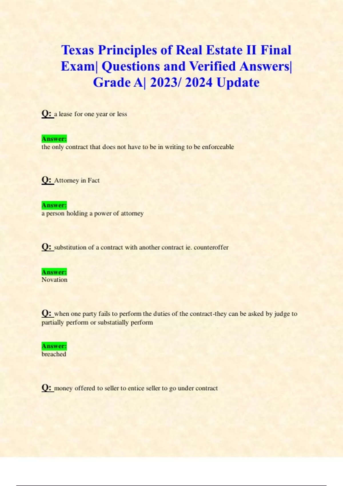 Texas Principles of Real Estate II Final Exam| Questions and Verified Answers| Grade A| 2023/ 2024 Update Q: a lease for one year or less Answer: the only contract that does not have to be in writing to be enforceable Q: Attorney in Fact Answer: a person holding a power of attorney Q: substitution of a contract with another contract ie. counteroffer Answer: Novation Q: when one party fails to perform the duties of the contract-they can be asked by judge to partially perform or substatially perform Answer: breached Q: money offered to seller to entice seller to go under contract Answer: earnest money Q: gives buyer the right to demand legal title to the property when the purchase price is paid Answer: equitable title Q: seller financing and buyer does not get deed until the property has been paid for in full Answer: contract for deed/installment contract Q: that the property may contain lead based paint-Federal Law Answer: if property was built before 1978 seller must disclose _______ is the principle that the more similar properties there are on the market, the lower the price will be driven. Answer: Competition Q: A _____ is made when a property is sold for more than the original price. Answer: Profit Q: A _____ is the bottom number of a fraction. Answer: Denominator Q: A _____ is the top number of a fraction. Answer: Numerator Q: A ______ is a ratio that compares two quantities. Answer: Rate Q: A 20-unit apartment building sells for $5 million. The property can bring in $400,000 in annual gross income. What is the gross income multiplier (GIM)? Answer: 12.5 Q: A form of depreciation or loss in value caused by defects in design is called _______. Answer: Functional obsolescence Q: A licensee must understand risks and provide disclosure of known environmental issues. A licensee must also do which of the following? Answer: Know when to ask questions. Q: A loss in value caused by an undesirable or hazardous influence offsite is which type of depreciation? Answer: External depreciation Q: A property appraises at $320,000. If the assessment rate is 100% and the tax rate is $1 per $100, what are the semi-annual property taxes? Answer: $1,600 Q: A property generates $30,000 in net operating income and has a 15% cap rate. Using the income approach, what is its value? Answer: $200,000 Q: A real estate transaction has a closing date of April 20. The seller, who's responsible for closing costs up to and including the day of settlement, has already paid property taxes of $1,447 for the calendar year. If proration is based on a statutory calendar, the buyer will be_______ on the closing statement. Answer: Debited $1,005 - The buyer will be debited $1005 because the buyer owes the seller this amount for taxes the seller already paid. $1,447 ÷ 360 = $4.02, and $4.02 × 250 days = $1005.