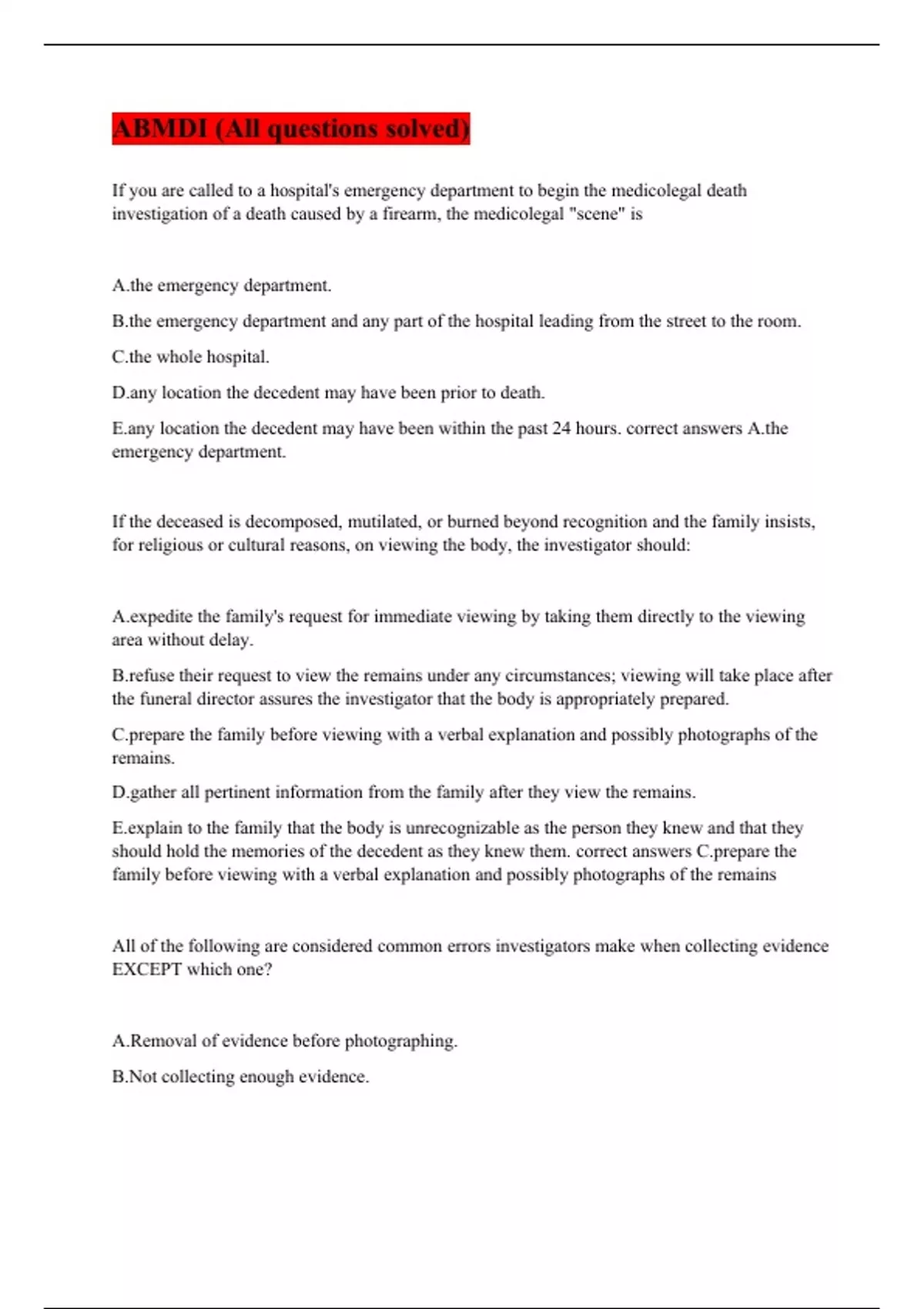 If you are called to a hospital's emergency department to begin the medicolegal death investigation of a death caused by a firearm, the medicolegal "scene" is A.the emergency department. B.the emergency department and any part of the hospital leading from the street to the room. C.the whole hospital. D.any location the decedent may have been prior to death. E.any location the decedent may have been within the past 24 hours. correct answers A.the emergency department. If the deceased is decomposed, mutilated, or burned beyond recognition and the family insists, for religious or cultural reasons, on viewing the body, the investigator should: A.expedite the family's request for immediate viewing by taking them directly to the viewing area without delay. B.refuse their request to view the remains under any circumstances; viewing will take place after the funeral director assures the investigator that the body is appropriately prepared. C.prepare the family before viewing with a verbal explanation and possibly photographs of the remains. D.gather all pertinent information from the family after they view the remains. E.explain to the family that the body is unrecognizable as the person they knew and that they should hold the memories of the decedent as they knew them. correct answers C.prepare the family before viewing with a verbal explanation and possibly photographs of the remains All of the following are considered common errors investigators make when collecting evidence EXCEPT which one? A.Removal of evidence before photographing. B.Not collecting enough evidence.