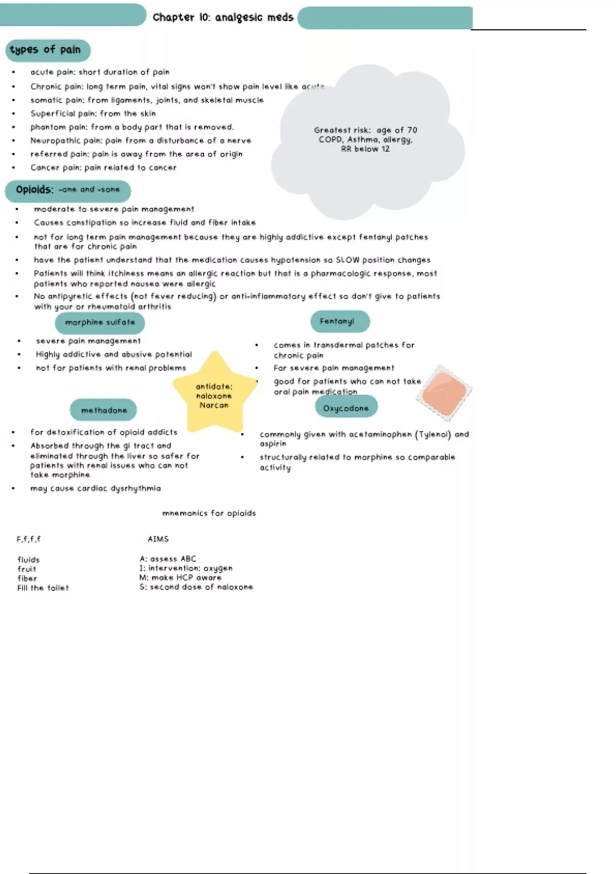 Chapter 10: analgesic medstypes of pain•acute pain: short duration of pain•Chronic pain: long term pain, vital signs won't show pain level like acute•somatic pain: from ligaments, joints, and skeletal muscle•Superficial pain: from the skin•phantom pain: from a body part that is removed. •Neuropathic pain: pain from a disturbance of a nerve•referred pain: pain is away from the area of origin•Cancer pain: pain related to cancerOpioids: -one and -sone•moderate to severe pain management•Causes constipation so increase fluid and fiber intake•not for long term pain management because they are highly addictive except fentanyl patches that are for chronic pain•have the patient understand that the medication causes hypotension so SLOW position changes•Patients will think itchiness means an allergic reaction but that is a pharmacologic response, most patients who reported nausea were allergic•No antipyretic effects (not fever reducing) or anti-inflammatory effect so don't give to patients with your or rheumatoid arthritis morphine sulfate•severe pain management•Highly addictive and abusive potential•not for patients with renal problemsFentanyl•comes in transdermal patches for chronic pain•For severe pain management•good for patients who can not take oral pain medicationmethadone•for detoxification of opioid addicts•Absorbed through the gi tract and eliminated through the liver so safer for patients with renal issues who can not take morphine•may cause cardiac dysrhythmia Oxycodone•commonly given with acetaminophen (Tylenol) and aspirin•structurally related to morphine so comparable activityantidote: naloxoneNarcan mnemonics for opioidsF,f,f,ffluidsfruitfiberFill the toiletAIMSA: assess ABCI: intervention: oxygenM: make HCP awareS: second dose of naloxoneGreatest risk: age of 70COPD, Asthma, allergy, RR below 12 Dependence vs tolerancedependence is when a patient's body will show withdrawals. The patient will have to discontinue the medication. There is a physical dependence and a psychological dependence. Physical can occur from stopping a drug abruptly and physiological is when the patient wants the drug for reasons outside of pain relief. Tolerance is from repetitive use of a drug resulting in needing a increased dosage. Tolerance will nt have withdrawn symptoms.non-opioidsAcetaminophen Tylenol •substitute for aspirin •mild to moderate pain•Fewer drug interactions•Antipyretic effect•choice for children and infants with the flu/fever•:( possible liver disease for dosages over 3,000 or 2,000 for elderly•AE: nausea, vomiting, hepatotoxicity, nephrotoxicity•Antidote: acetylcysteineTramadol •moderate to severe pain•Rapidly absorbed•Absorption is unaffected by food•AE: drowsiness, dizziness, headache, nausea, constipation, respiratory depression•Seizures reported in patients taking both normal and excessive dosage•Contraindication in patients who take antidepressantsLidocaine (transdermal)•a topical anesthetic•Local pain relief•Skin may develop redness or edema•Can be used with antidepressants Acute pain: myocardial infarction, dental procedures, surgical procedures, kidney stonesMorphine common for the surgical procedureschronic pain: arthritis, cancer, lower back painTransdermal patch for lower back pain, Tylenol for the arthritis for the anti-inflammatory effects