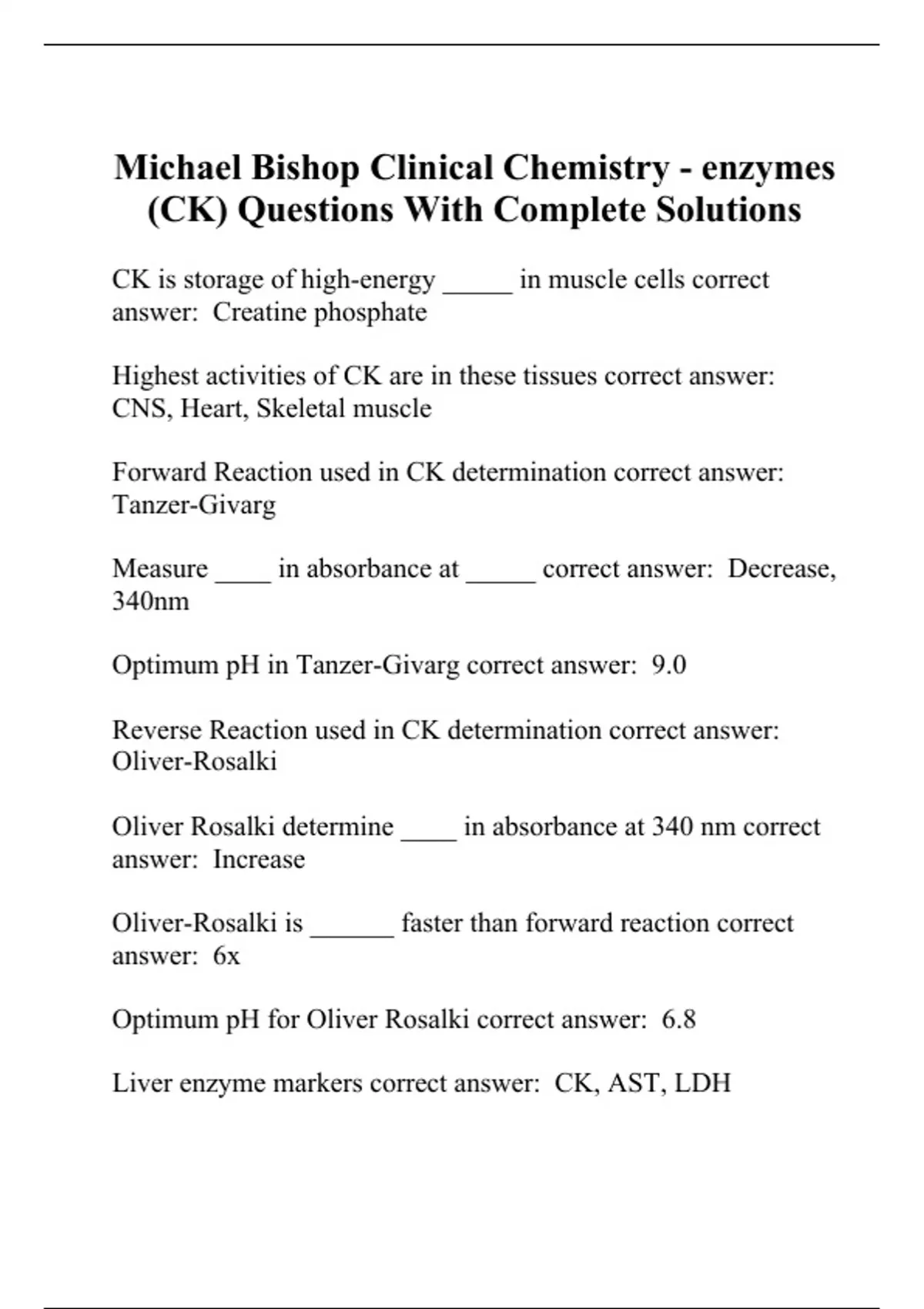 Michael Bishop Clinical Chemistry - enzymes (CK) Questions With Complete Solutions