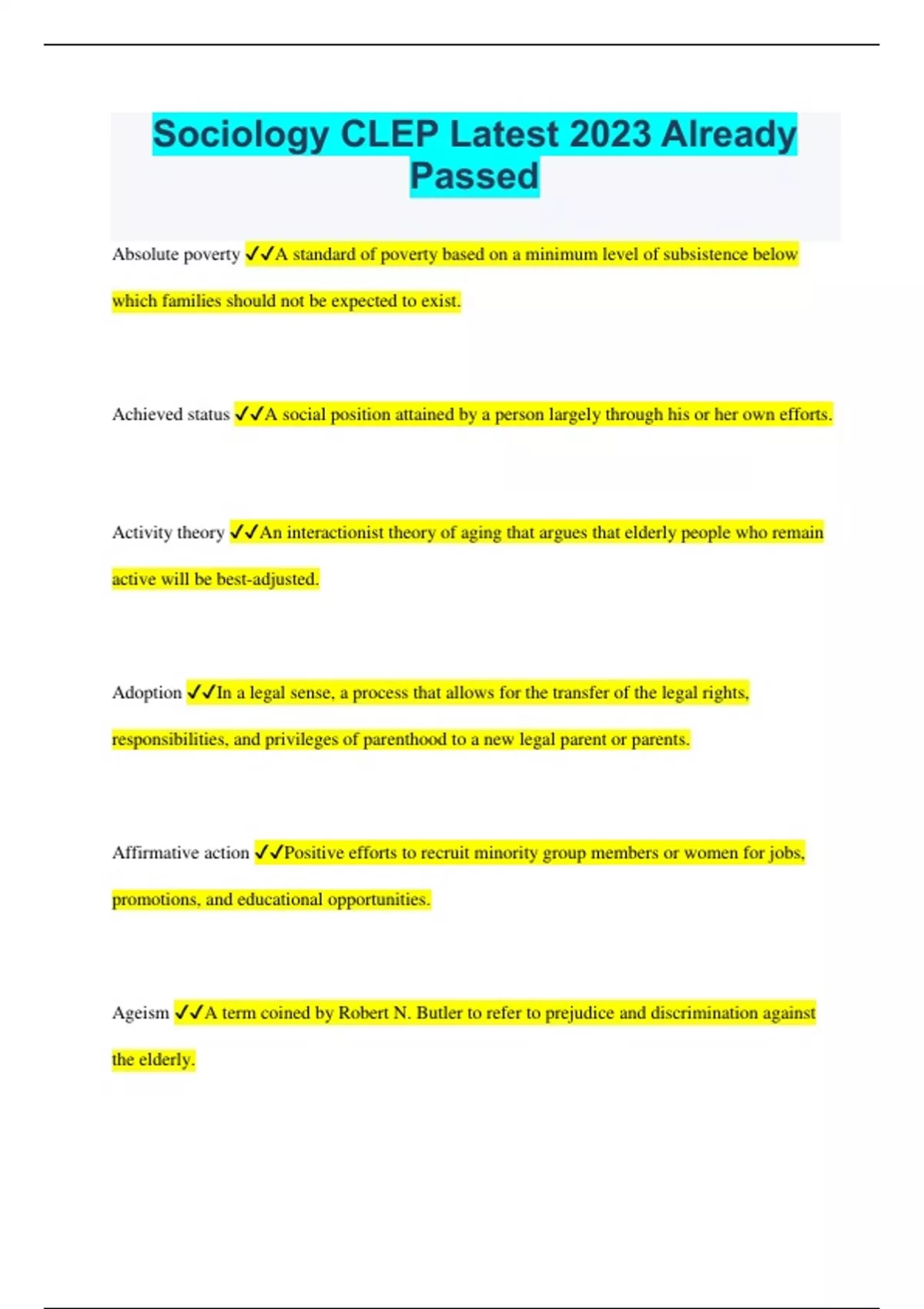 Sociology CLEP Latest 2023 Already Passed Absolute poverty A standard of poverty based on a minimum level of subsistence below which families should not be expected to exist. Achieved status A social position attained by a person largely through his or her own efforts. Activity theory An interactionist theory of aging that argues that elderly people who remain active will be best-adjusted. Adoption In a legal sense, a process that allows for the transfer of the legal rights, responsibilities, and privileges of parenthood to a new legal parent or parents. Affirmative action Positive efforts to recruit minority group members or women for jobs, promotions, and educational opportunities. Ageism A term coined by Robert N. Butler to refer to prejudice and discrimination against the elderly. Agrarian society The most technologically advanced form of preindustrial society. Members are primarily engaged in the production of food but increase their crop yield through such innovations as the plow. Alienation The condition of being estranged or disassociated from the surrounding society. Amalgamation The process by which a majority group and a minority group combine through intermarriage to form a new group. Anomie Durkheim's term for the loss of direction felt in a society when social control of individual behavior has become ineffective. Anomie theory of deviance A theory developed by Robert Merton that explains deviance as an adaptation either of socially prescribed goals or of the norms governing their attainment, or both. Anticipatory socialization Processes of socialization in which a person "rehearses" for future positions, occupations, and social relationships. Anti-Semitism Anti-Jewish prejudice. Apartheid The former policy of the South African government designed to maintain the separation of Blacks and other non-Whites from the dominant