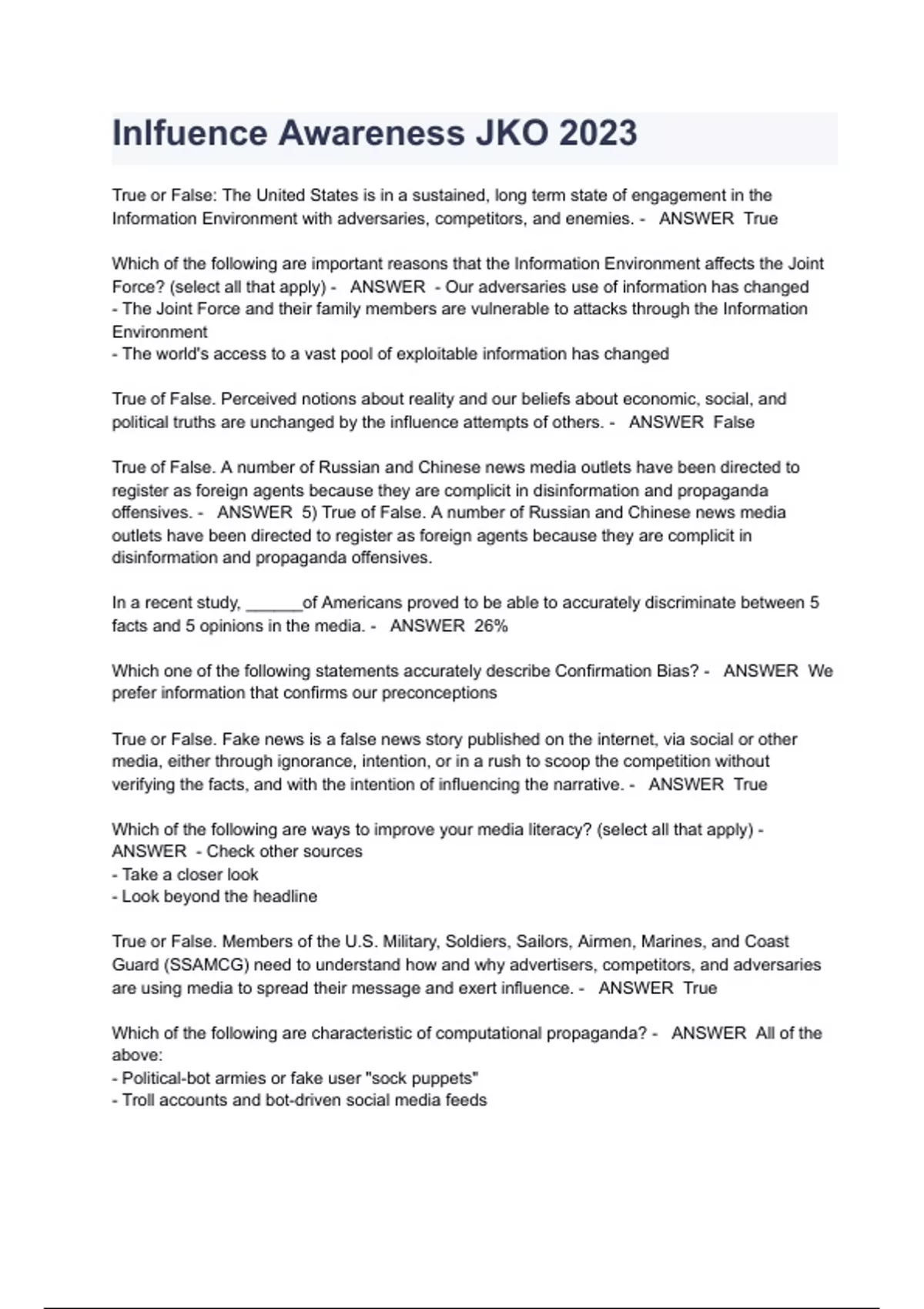 Inlfuence Awareness JKO 2023 WITH A+ SOLUTION GUIDE