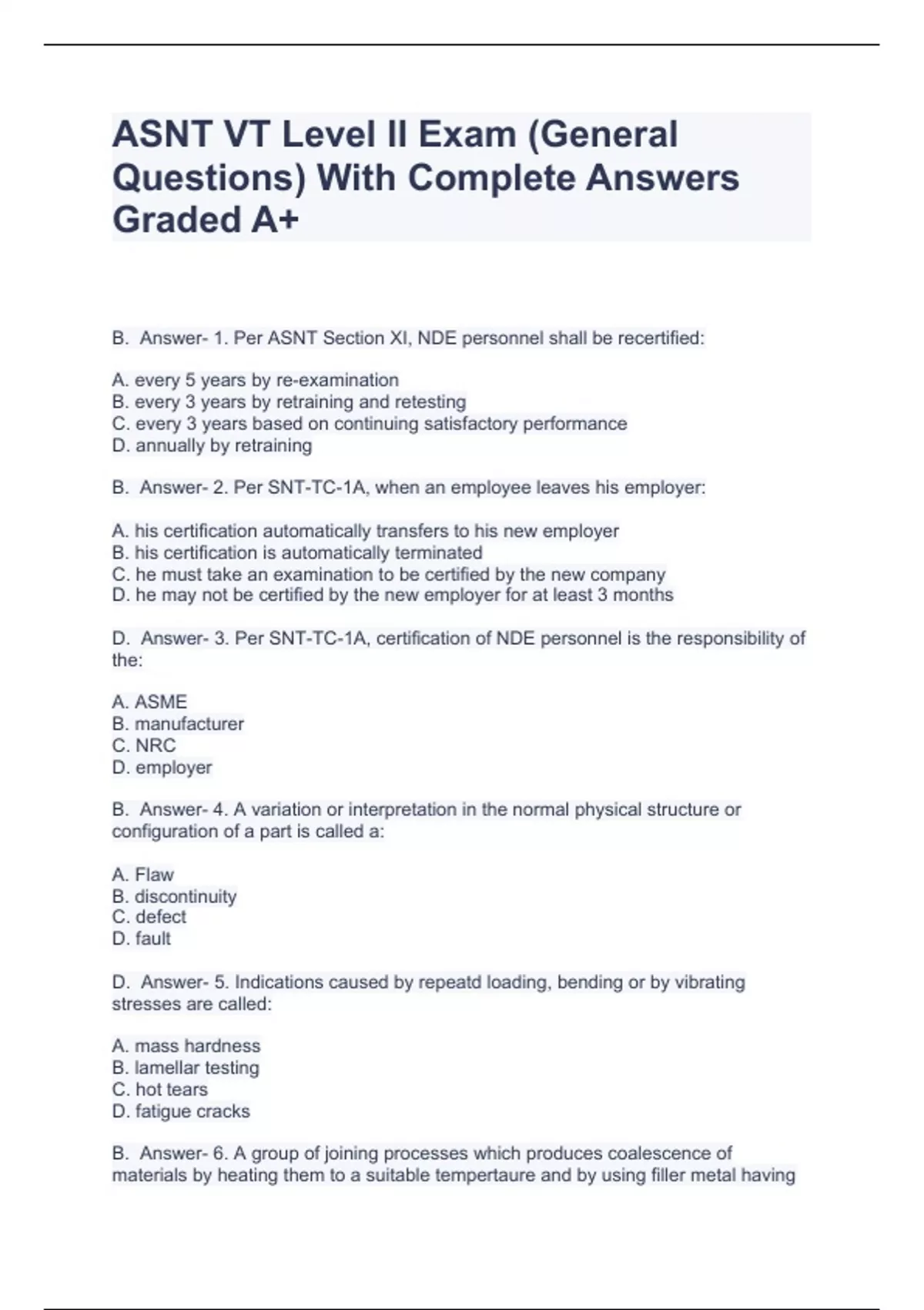 ASNT VT Level II Exam (General Questions) With Complete Answers Graded A+